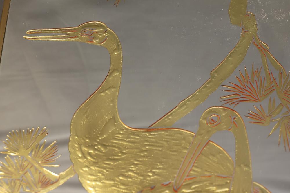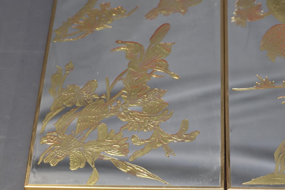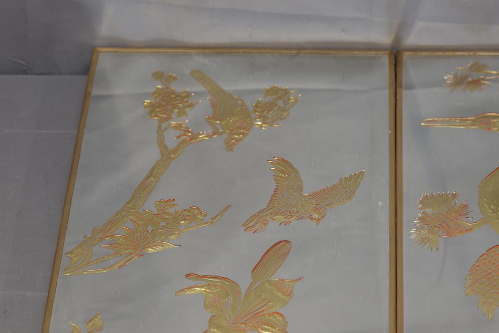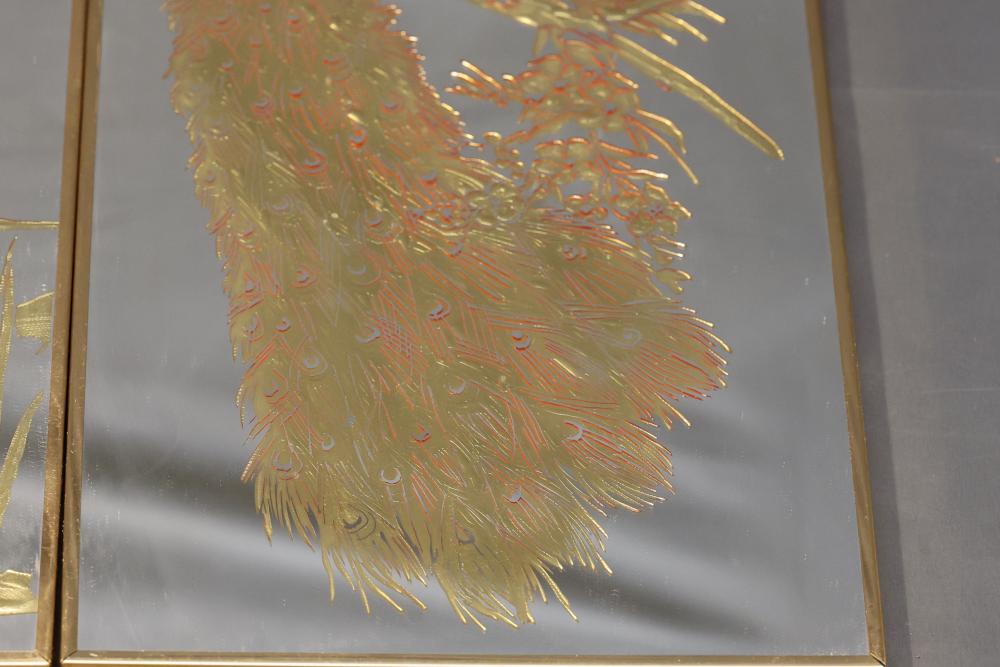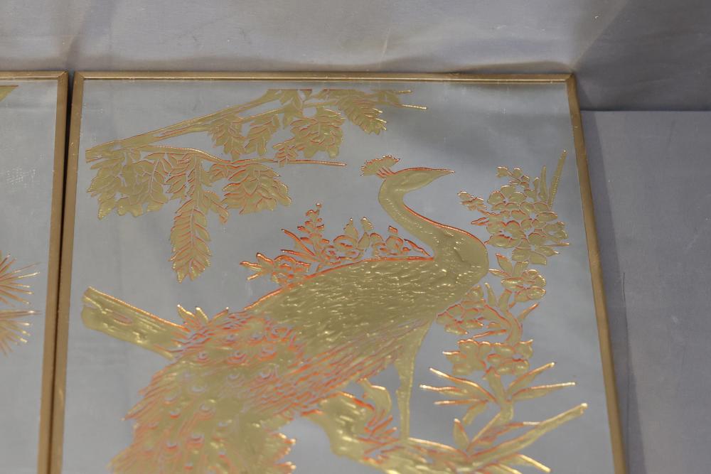Three Framed Gold-Tone Art Panels Featuring Birds and Foliage. Each panel depicts intricate designs of birds, including cranes, peacocks, and other avian species, surrounded by vegetation. Gold tones adorn a mirrored background, creating a reflective effect. The frames are gold-colored metal with solid backing. Pickup only.