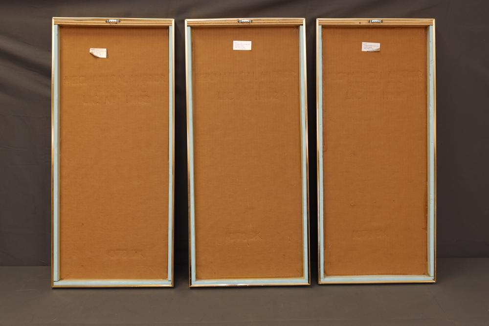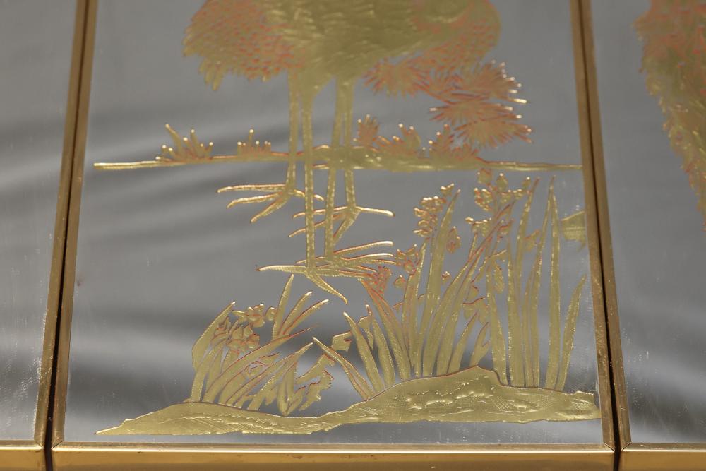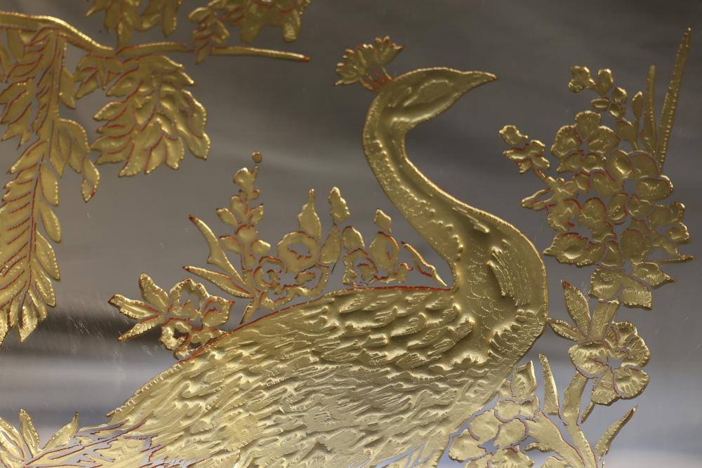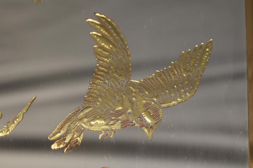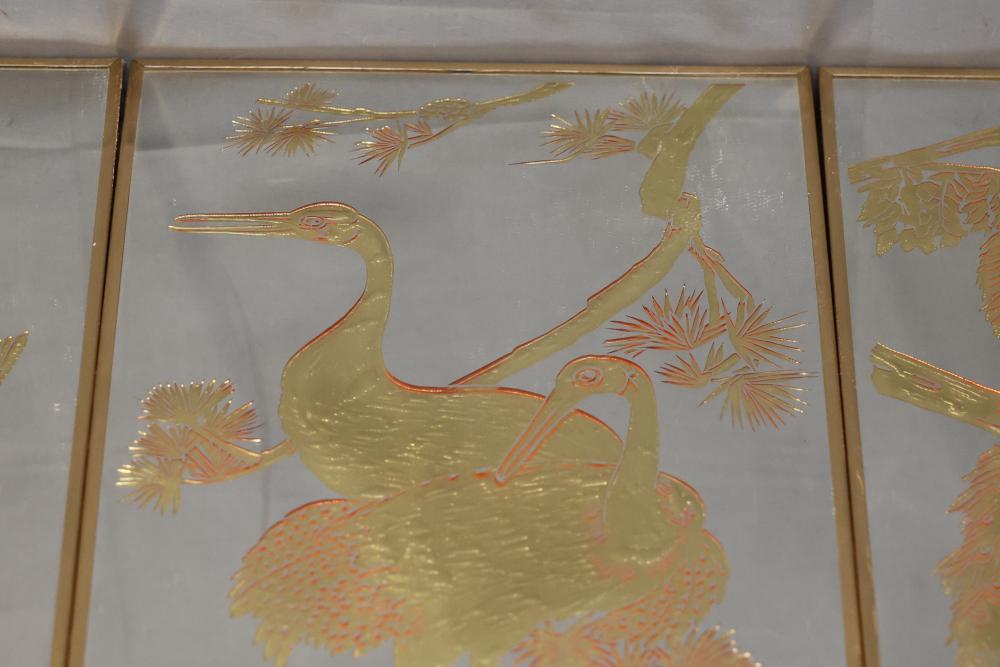 Three Framed Gold-Tone Art Panels Featuring Birds and Foliage. Each panel depicts intricate designs of birds, including cranes, peacocks, and other avian species, surrounded by vegetation. Gold tones adorn a mirrored background, creating a reflective effect. The frames are gold-colored metal with solid backing. Pickup only.