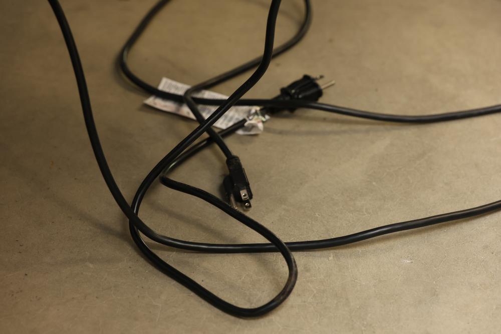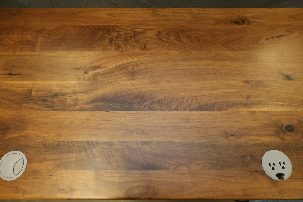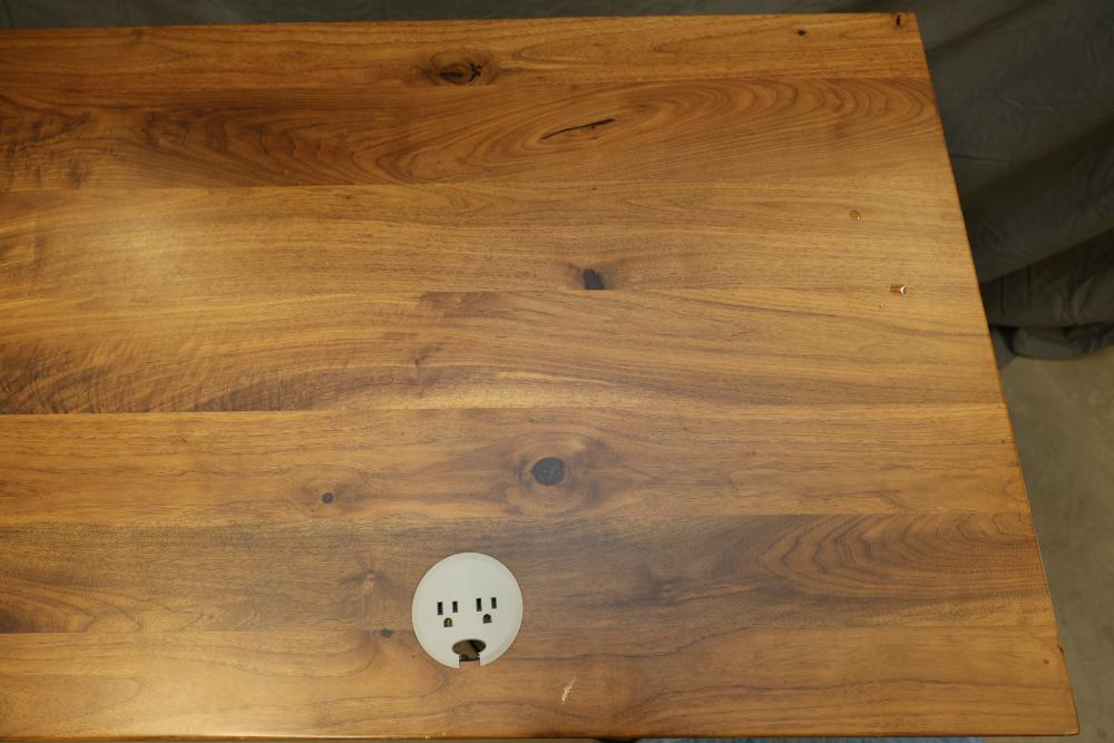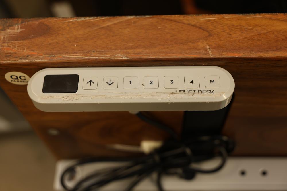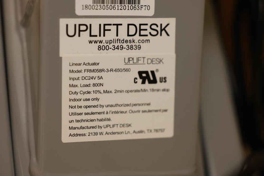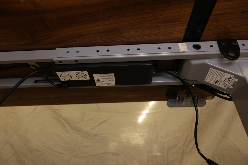 Uplift Desk Adjustable Standing Desk With Wood Top and Power Outlets. Features a natural wood top with integrated power outlets and cable cutouts, supported by an adjustable-height mechanism. Includes control panel with memory presets, attached cables, and electronics for motorized height adjustment. Pickup only.
