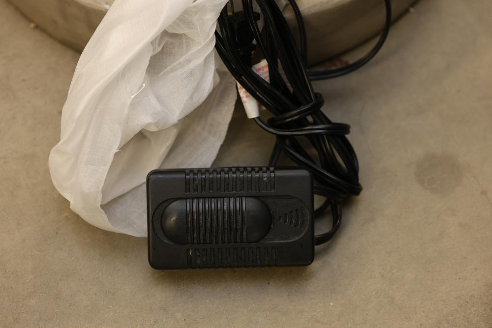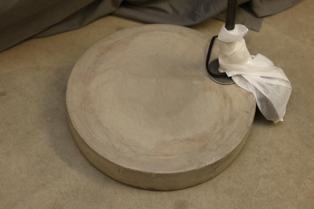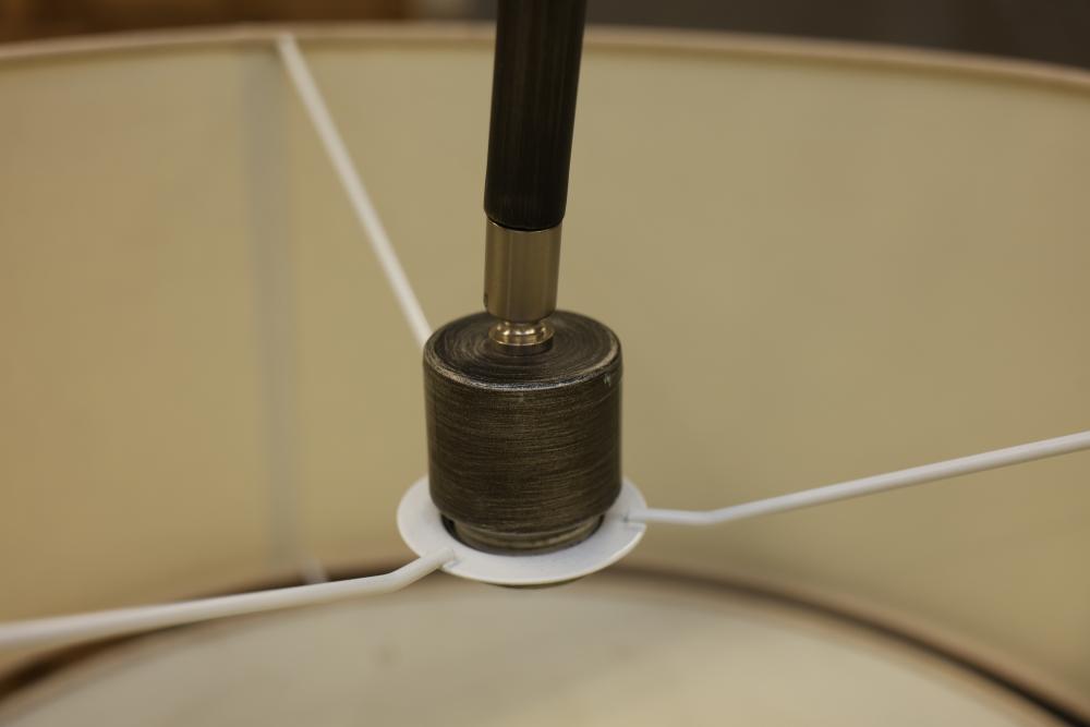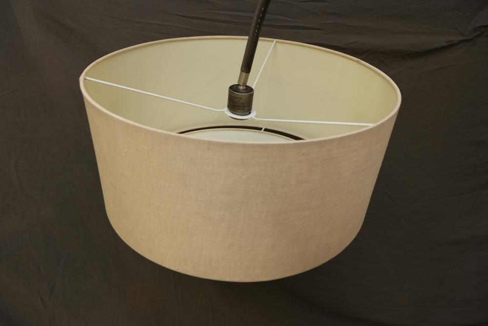 Large Arc Floor Lamp with Beige Drum Shade and Concrete Base. The lamp features a sleek metal arc design, a neutral beige drum shade, and a sturdy round concrete base. Includes an in-line black foot switch for easy operation. Pickup only.