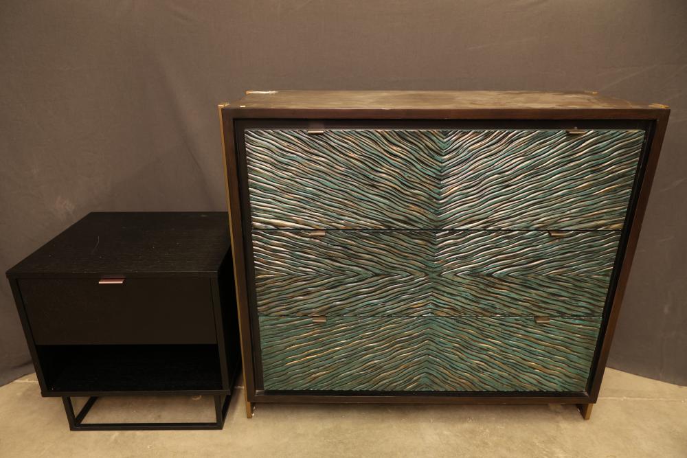 Hooker Furniture Wooden Nightstand and Chest with Drawers. The nightstand features a single drawer and open shelf space with a minimalist base. The chest includes four drawers with textured front panels and accented wooden and metal trim. Both pieces are sturdy and suitable for storage needs. Dresser - 38" x 41.5" x 17" and nightstand - 22" x 21" x 18". Pickup only.