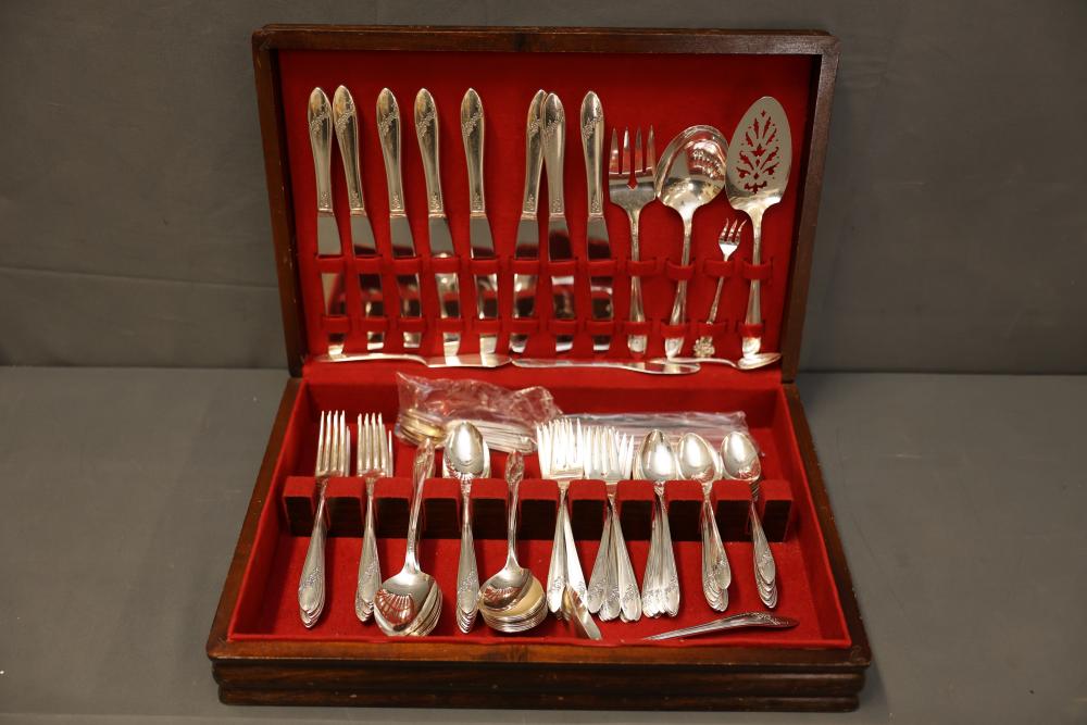 Oneida Community Tudor Plate Queen Bess Silverplate Flatware Set with Wood Storage Box. Set includes service for eight with additional serving pieces, featuring knives, forks, spoons, and serving utensils. Stored in a hinged wooden box with decorative detailing and red felt interior. Tarnish and use wear present. Pickup only.
