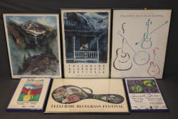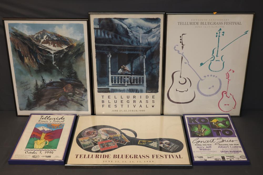 Framed Telluride event posters featuring designs for Bluegrass Festivals (1990, 1994) and the Brewer"s Festival (1994), with other concert art. Includes illustrations of mountain scenes, instruments, and event dates. Pickup only.