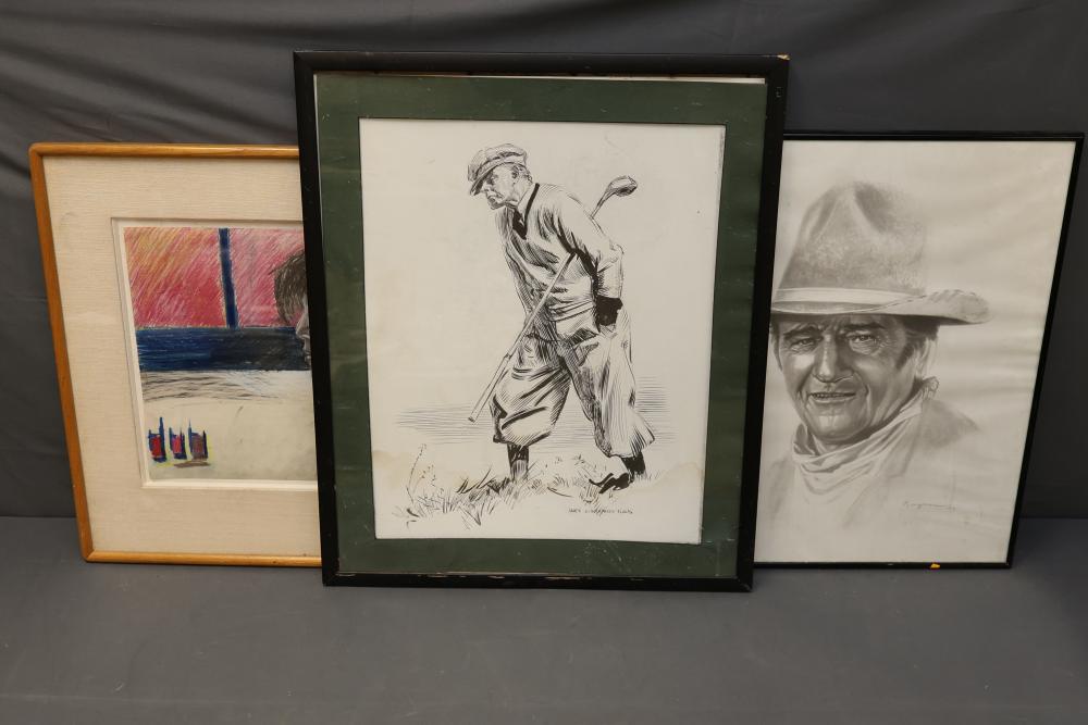 Three framed artworks. Includes pen and ink drawing titled 'The Dejected Golfer' by James Montgomery Flagg (21 1/2 x 27 1/2 in.), signed. A charcoal portrait signed Kingman (dated 1983) in a black frame. A mixed-media drawing titled 'Marianne' by Steve Smire (dated 1981) in a wooden frame. Frames show wear consistent with age. Pickup only.