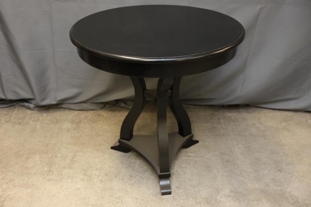 Black Round Pedestal Accent Table With Curved Legs. Features a round top with a smooth black finish and sturdy curved legs affixed to a stable base. 29"x30"dia. Pickup only.