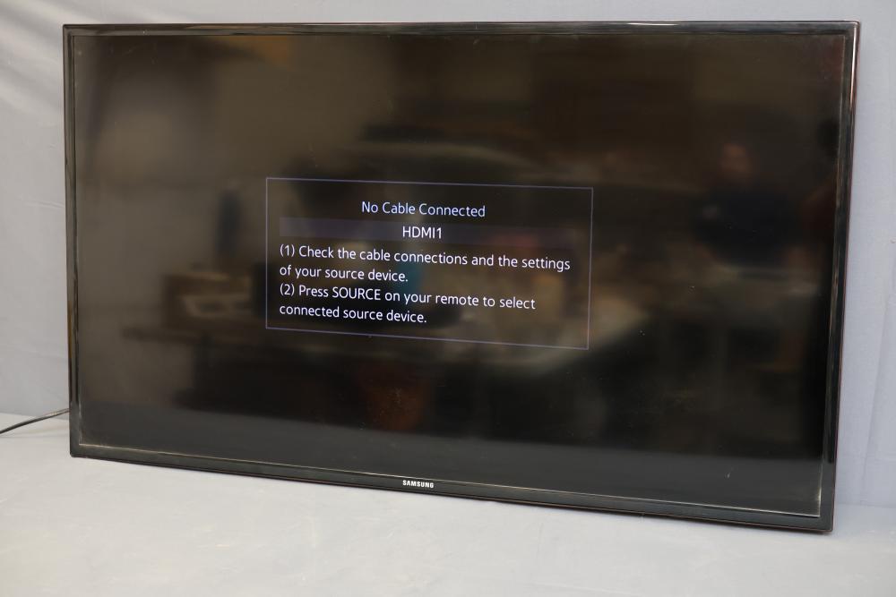 Samsung UN50H6201AF 50-Inch LED HDTV. Features multiple HDMI inputs, LAN port, and various component and audio input/output connections. Model manufactured in March 2015. Typical power consumption is 54W. Includes a functioning screen displaying. No Cable Connected. Does not have remote. Pickup only.