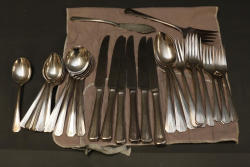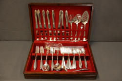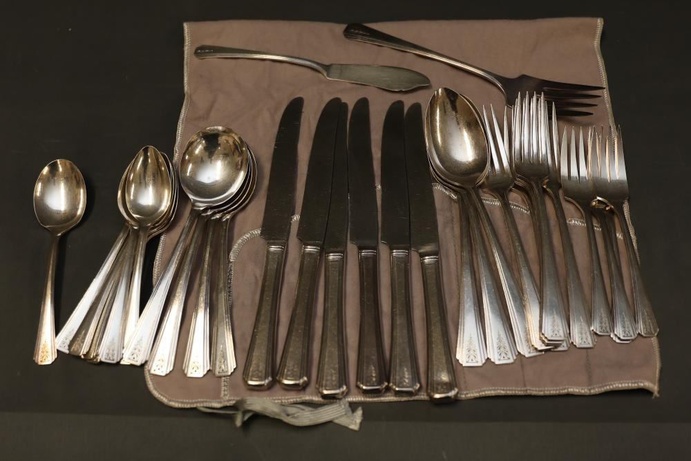 1940s Oneida Community Keller & Mannix Silver-Plated Flatware Set. Includes 6 knives, 6 dinner forks, 6 salad forks, 6 teaspoons, 4 soup spoons, 3 serving pieces, 1 butter knife, 1 sugar spoon, and 1 meat fork. Comes with fabric storage roll as shown in images. Condition shows some wear consistent with age and use. Pickup only.