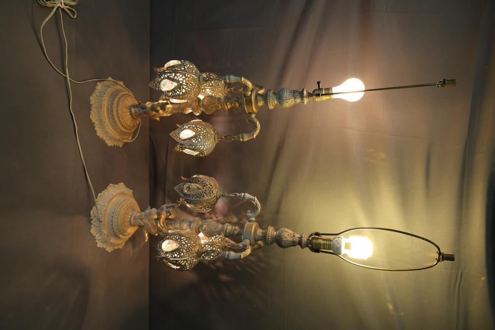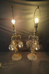 Ornate Brass Lamps With Prismatic Decorations and Shades. Each lamp features detailed brass construction with hanging prismatic decorative elements and ornate bases depicting cherubs. The lamps measure approximately 37 inches tall, including the finials, and come with fabric shades still wrapped in plastic. Some wear and patina consistent with age. Power cords are included. Pickup only.