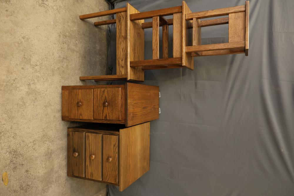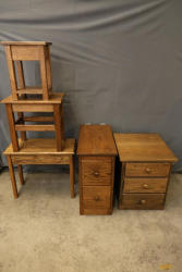 Handcrafted Wooden Furniture Set including two cabinets with drawers and three small tables. Made of wood with visible grain patterns and equipped with wooden drawer knobs. 24.5"x12"x24" and 21"x21"x18". Pickup only.