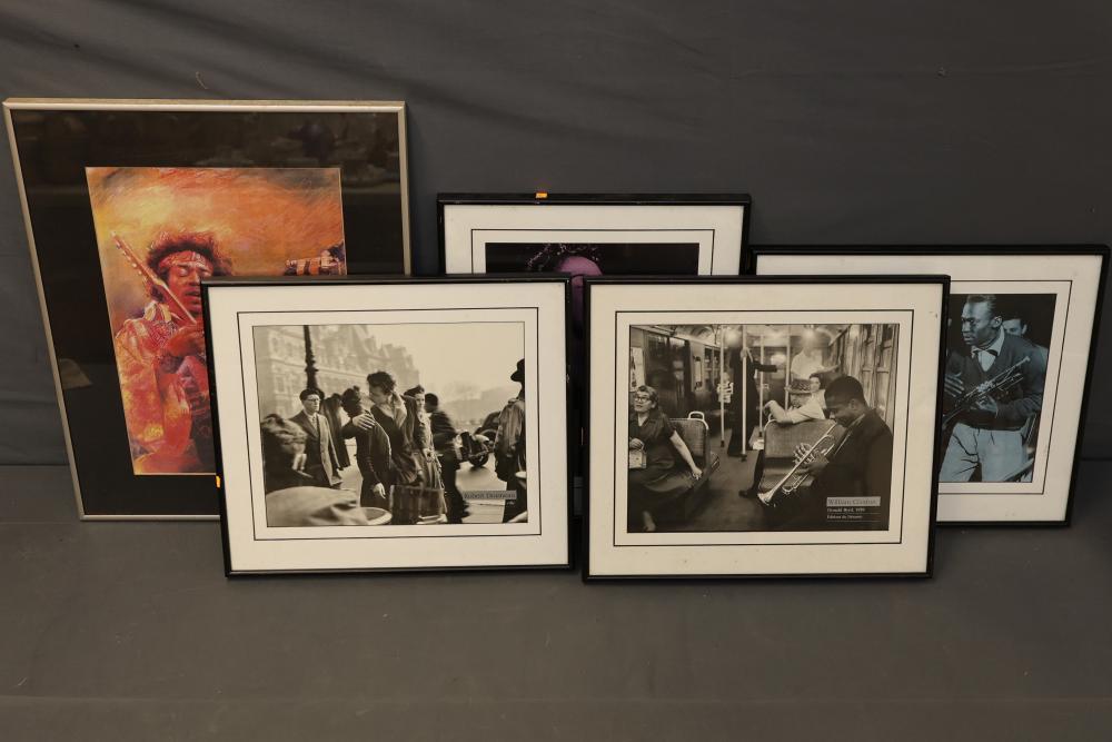 Framed Art Prints Featuring Musicians and Iconic Photography. Includes works by Robert Doisneau and William Claxton, along with other pieces depicting notable figures. Frames are predominantly black with hanging wire secured on the reverse. Pickup only.