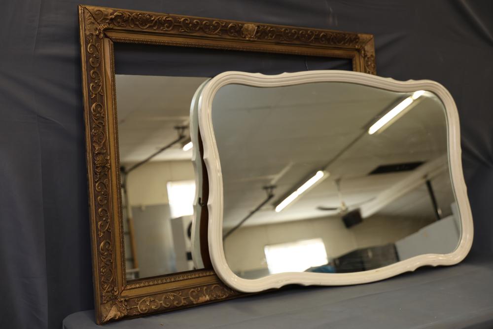 Rectangular mirrors, including one with a carved gilt wooden frame featuring floral and scroll motifs and one with a white-painted frame with simple curves. The gilt frame shows evident areas of wear and damage at corners and edges, while the white frame is in better condition. Pickup only.