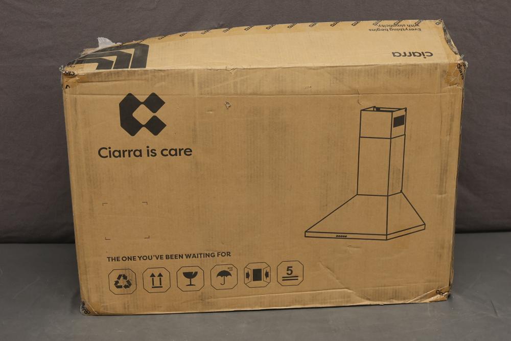 Ciarra CAB75206P Range Hood with Carbon Filters and Accessories. Includes carbon filters, installation hardware, instruction manual, and exhaust duct components. Features LED lighting, multiple fan speeds, and a black finish. Model number CAB75206P, 120V/60Hz, 2.5A. Pickup only.