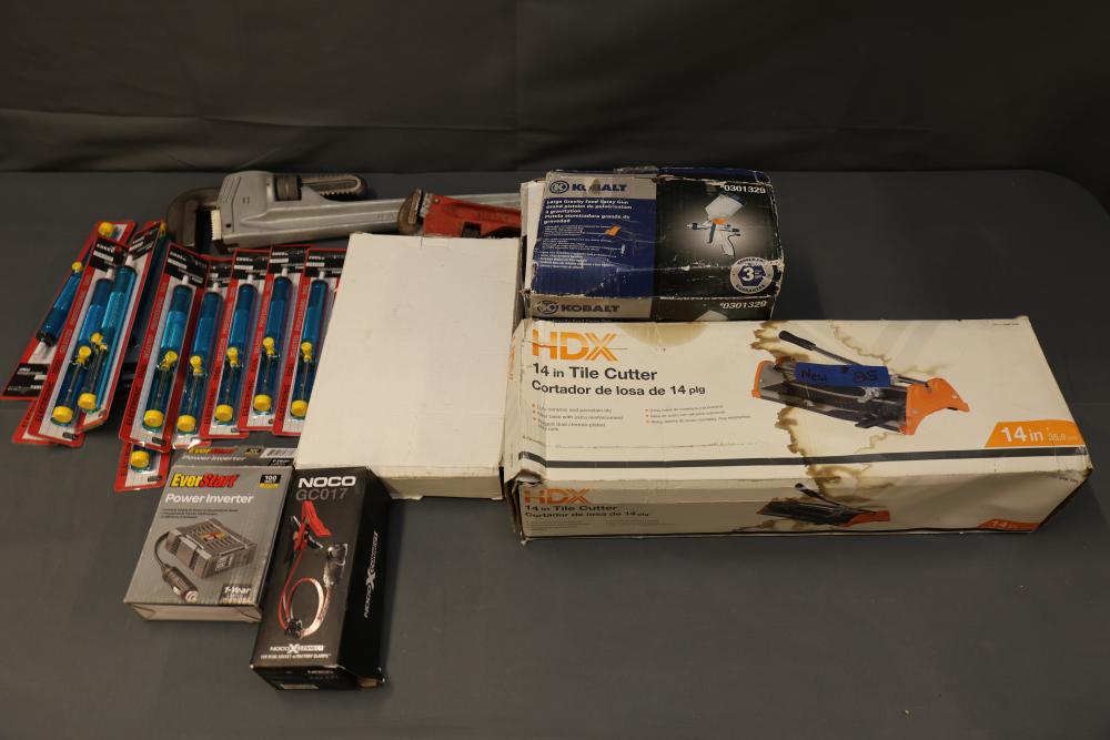 Tools and Equipment Including Tile Cutter and Desoldering Pumps. Includes items such as a hand tool set with case, two pipe wrenches (24-inch aluminum alloy and 14-inch heavy-duty), nine Kobalt-branded desoldering pumps, a 14-inch HDX tile cutter (box shows wear), a Kobalt large gravity feed spray gun (unused, box shows wear), a NOCO jump starter cable, and an EverStart power inverter. Pickup only.