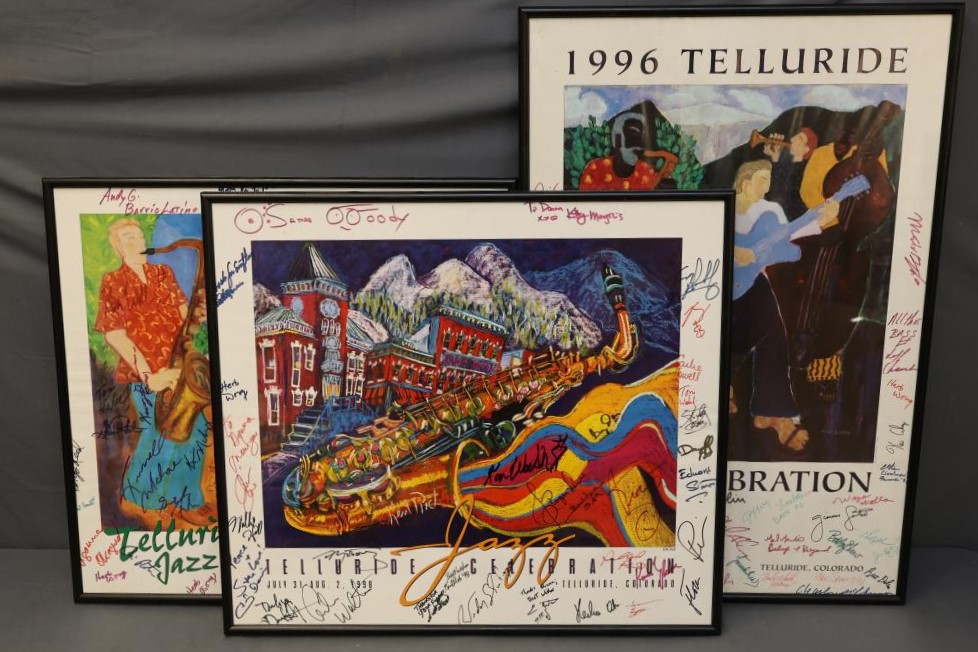 Three Signed Telluride Jazz Celebration Posters from 1996-1998 featuring colorful artwork by Mark Barry and Kent Pickett. Each poster is hand-signed by multiple individuals, likely associated with the event. Posters are framed and showcase event details, including dates and location in Telluride, Colorado. Largest is 36.5"x24.5". Pickup only.