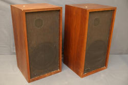 KLH Model Six Acoustic Suspension Loudspeaker Systems with Original Cables. Features include wood cabinets, fabric speaker grills, rear adjustment knobs for high-frequency levels, and input connectors for an amplifier. Pickup only.