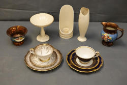 Ceramic Tableware and Decorative Items. Includes hand-painted jug and bowl with floral and animal motifs, two fine porcelain trios featuring gilded cups, saucers, and plates with intricate patterns, one marked "Bavaria Echtelthal," another marked "Royal East"; a stemmed compote dish with scalloped edge and gold trim, a tall vase and matching candle holder with gold accents, and a painted porcelain pitcher with floral designs. Pickup only.