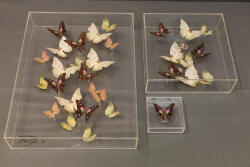 Acrylic display cases containing preserved butterflies in various colors, including white, brown, pink, green, and yellow tones. The butterflies are mounted within three clear acrylic cases of varying sizes. Each case is signed 'Puringho '01,' visible in the lower corner. Pickup only.