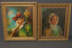 Two Framed Oil Paintings by Giocasta and Marchi. The first painting signed Giocasta with a date of 1969 and depicts a youthful character with a red hat. The second painting signed Marchi with a date of 1968 and portrays a refined lady in traditional attire. Both paintings are framed and include authenticity labels on the reverse. Largest 27"x23.5". Pickup only.