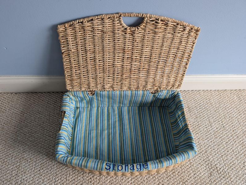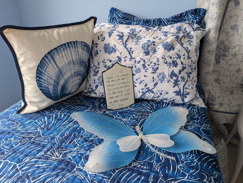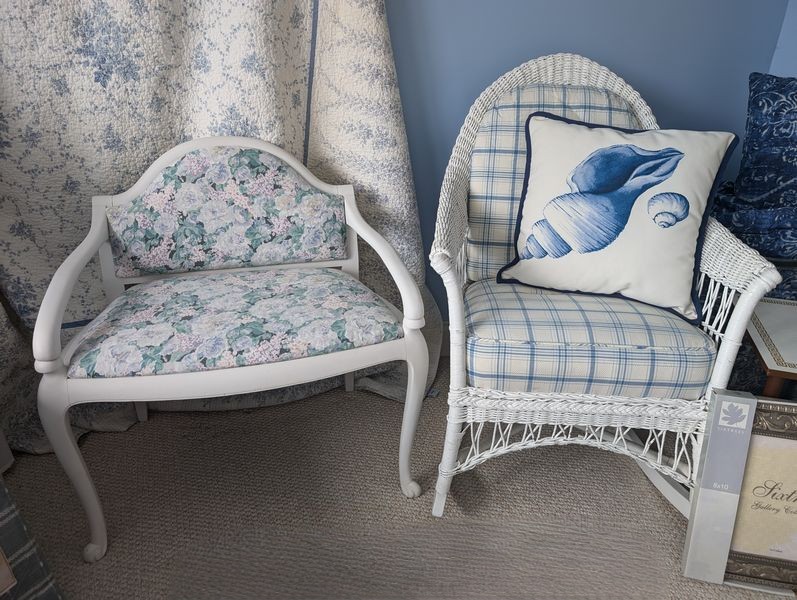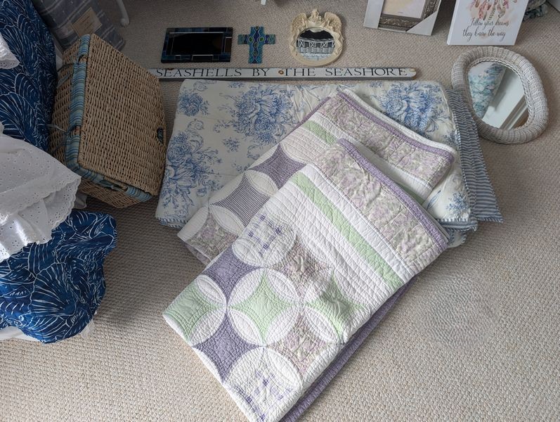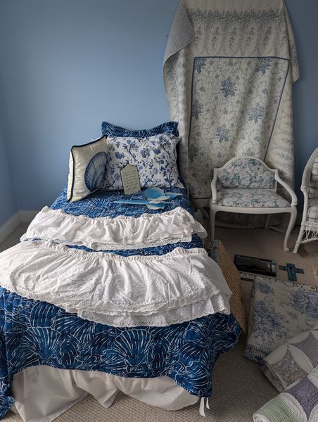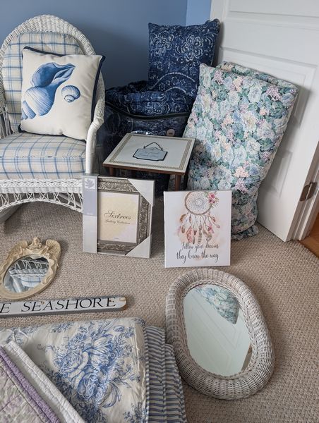Bedroom Furniture and Décor. Blue and white beach-themed furn, incl: white wicker rocker, 26"Wx29"Dx37"H and white painted two-seater bench, 27"Wx19"Dx29.5"H; covered wicker storage basket; sm table, 15"sq x16"H; assort pillows; bedding, incl: King comforter & single throw pillow; 2 twin purple quilts; Queen or full blue & white comforter; petite floral comforter; seashell pillows, ea. 18"sq; décor as seen in photos. Twin mattress opt. Loc on 2nd floor.