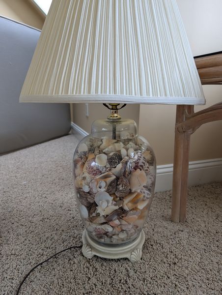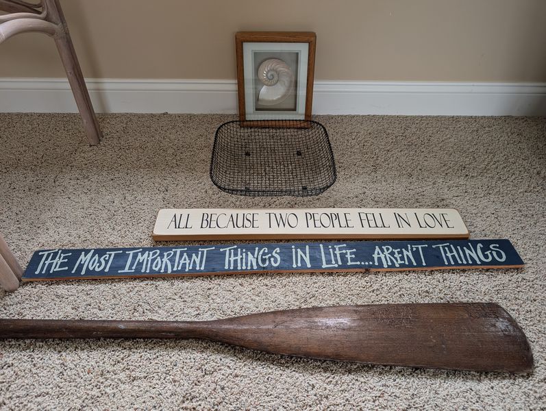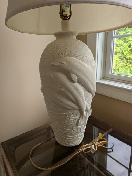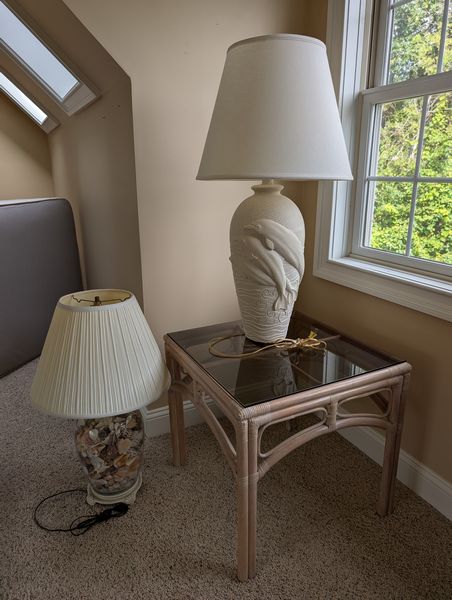 Wood Oar, Beach-Themed Furniture and Décor. Glass top end table, 2'sq 22.5"H; two table lamps, 30"H & 3'H w/ shades (dolphin lamp missing finial); antique wood oar, 6'L stamped by maker; assort décor as seen in photos. Loc on 2nd floor.