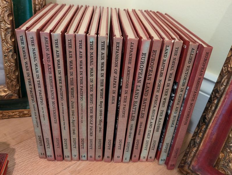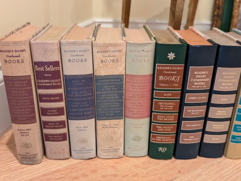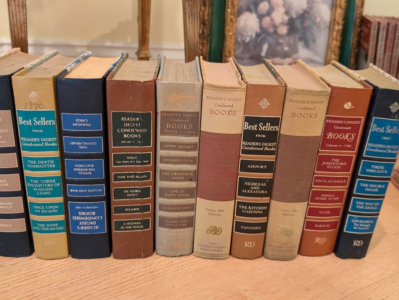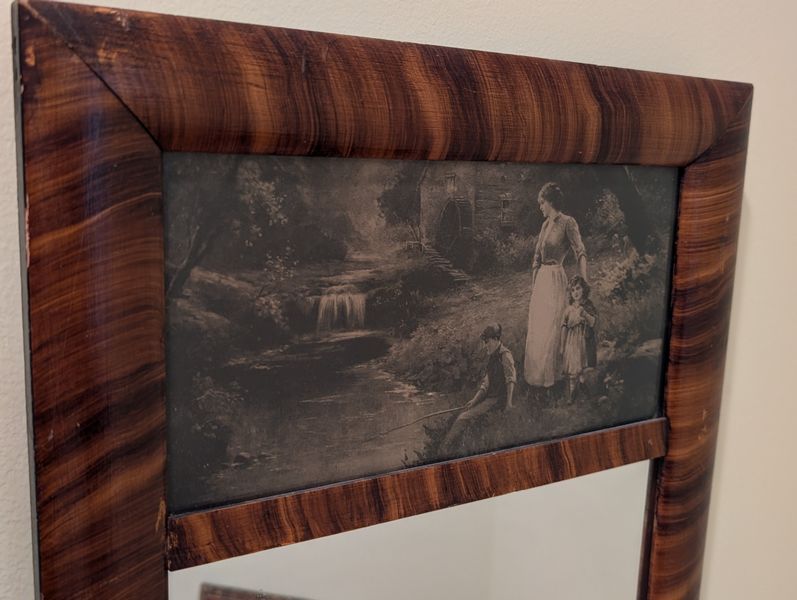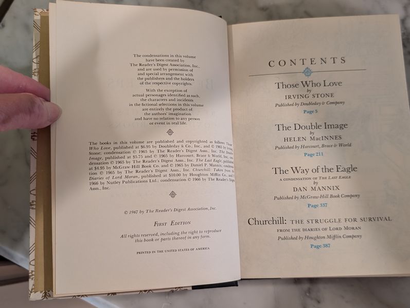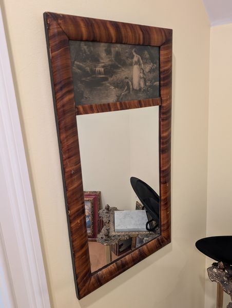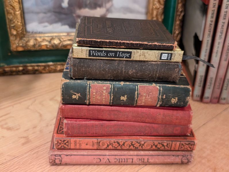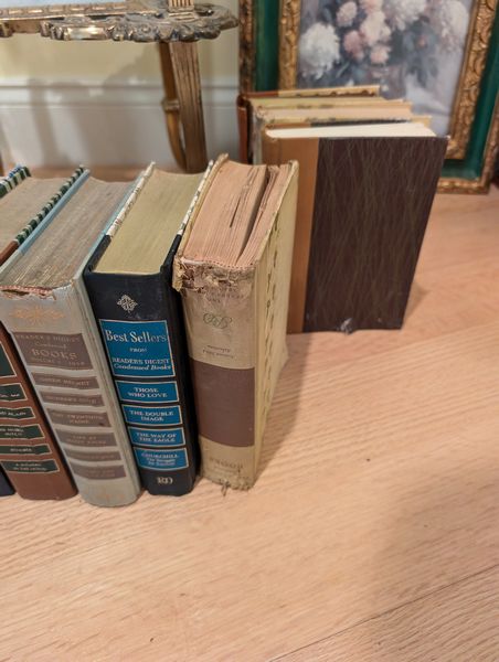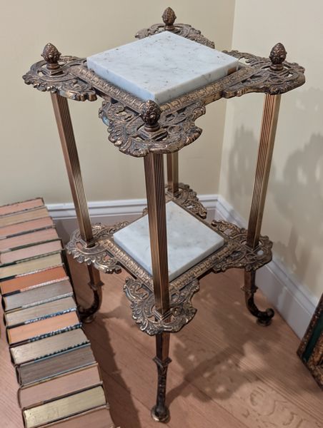 Antiques, featuring Books and Table. Ornate tiered side table w/ marble inserts on top & bottom surface, 13"Sq x 27.5"H; tiger maple wall mirror depicting fam by stream, 15.5"Wx28"H; ladies' black stylish hat; set/2 floral wall art, ea. 14.5"Wx16.5"H in wide frames; assort books, incl: 16 Franklin Watts military history books; 18 set Reader's Digest Best Sellers; sm books feat 1853 Seven Testaments (Latin); Paris 1878 inscribed, 1924 (2) World Lit, 1925 Etiquette, 1916 The Little V.C. novel. Loc on 2nd floor.
