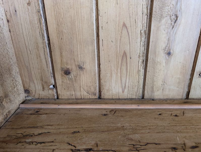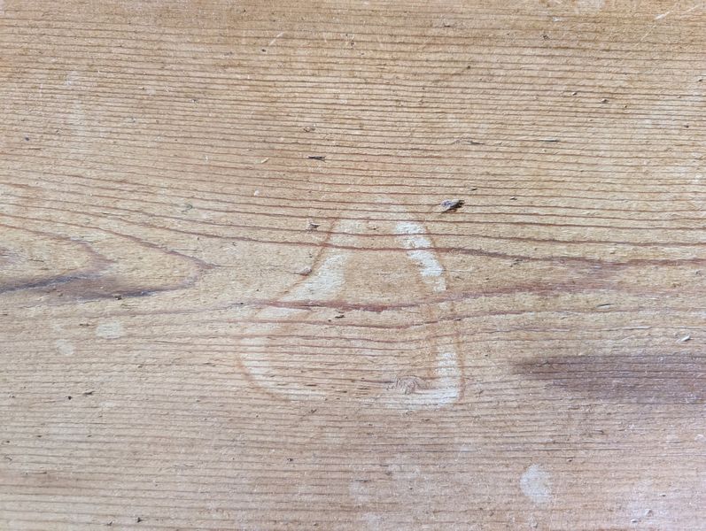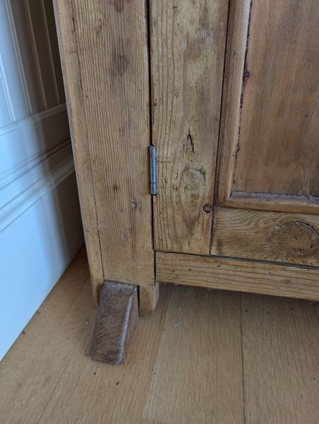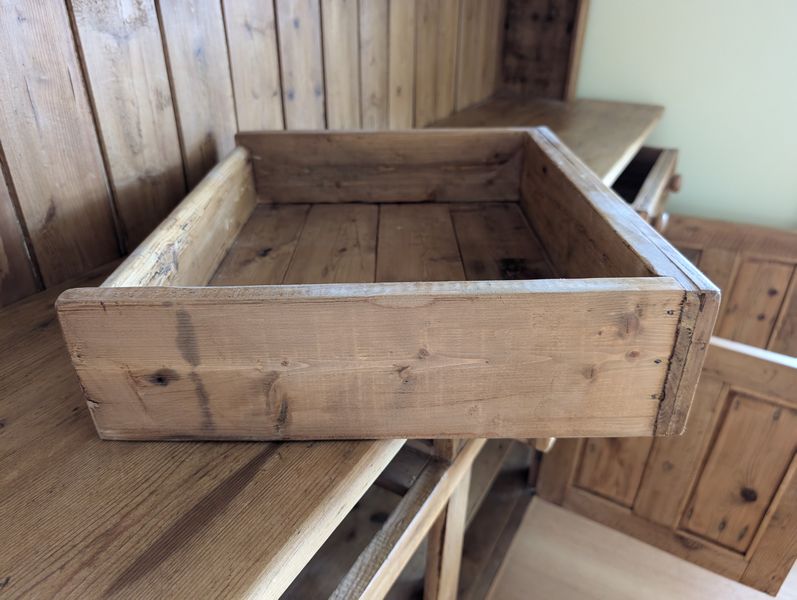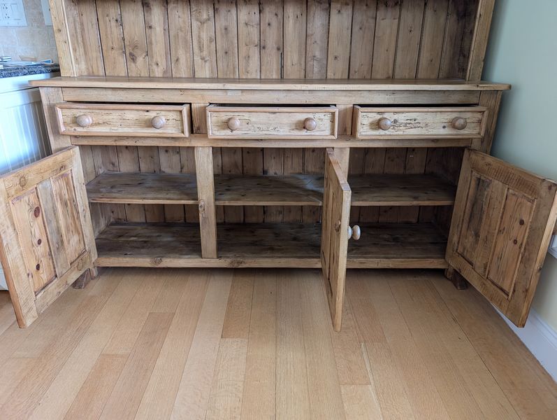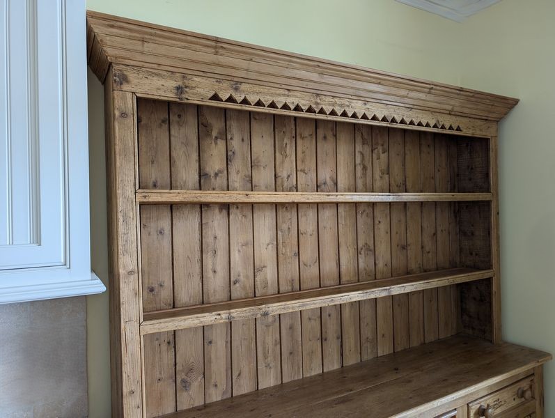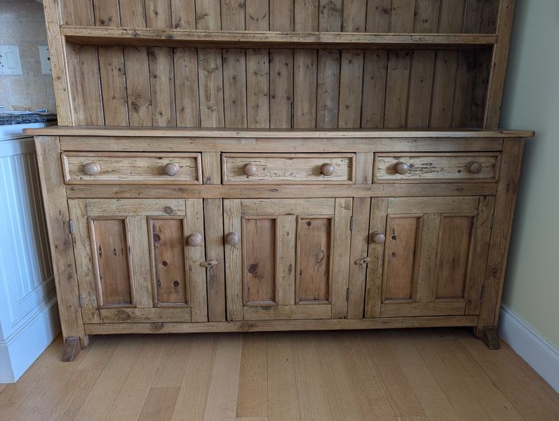 Antique Open Hutch. Pine country-style hutch w/ crown molding, 3 drws, 2 cab's, bead board backing w/ plate grooved shelves, wood knobs, const w/ nails (believed to be one lg piece, may req tools to dismantle). Base, 5'Wx17.5"Dx34.25"H; hutch 6'3"W (at top of molding) x47.25"H (overall approx. 80"H). Note there is a heart-shaped imprint on cab-see photo.
