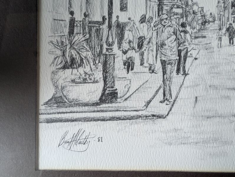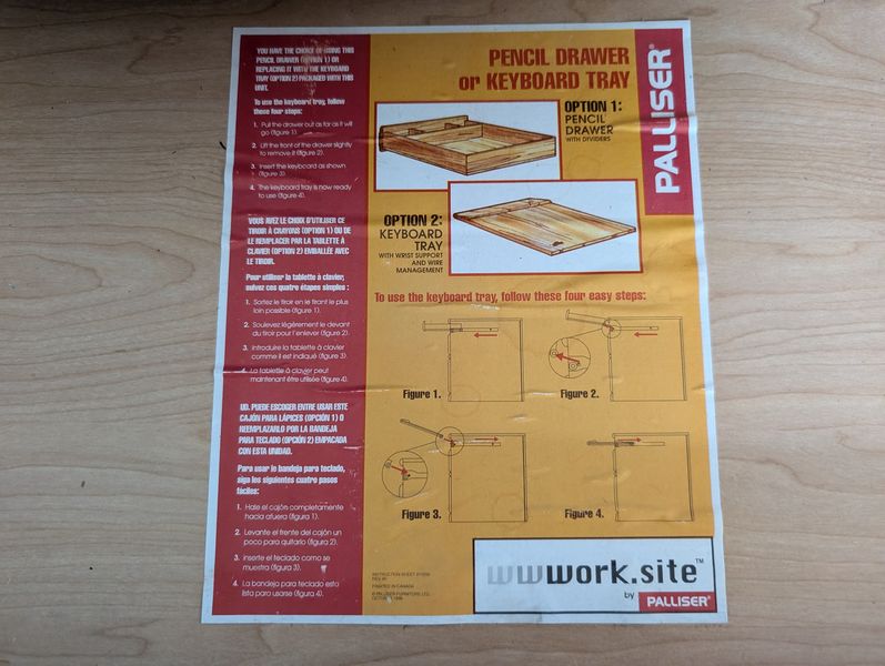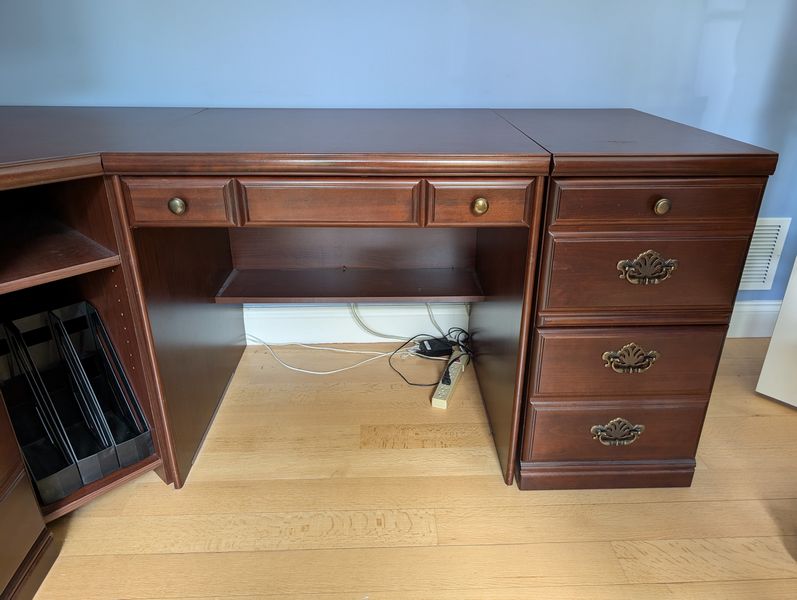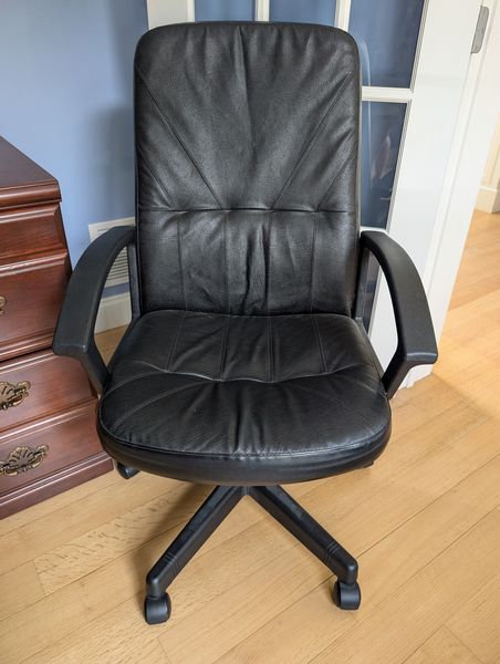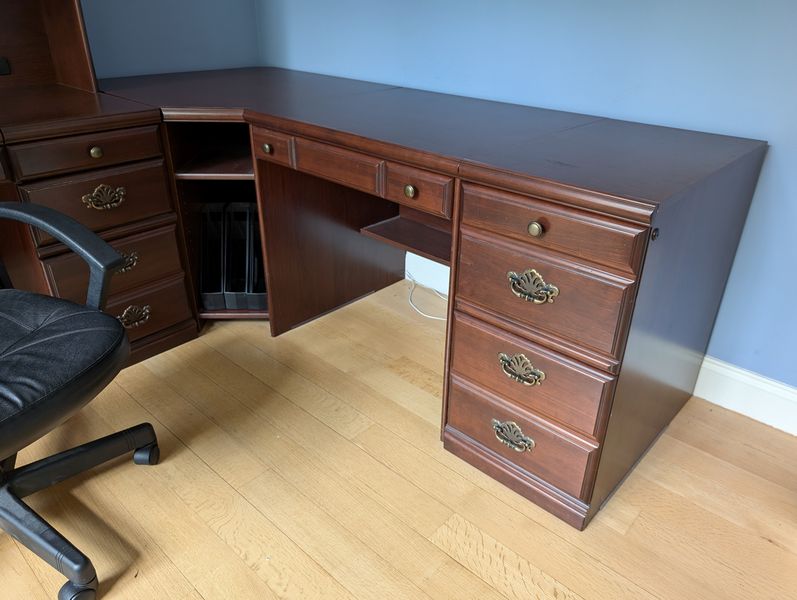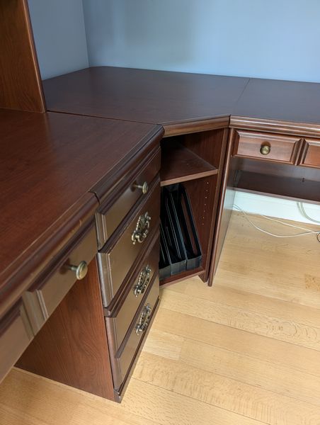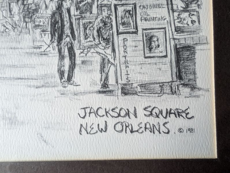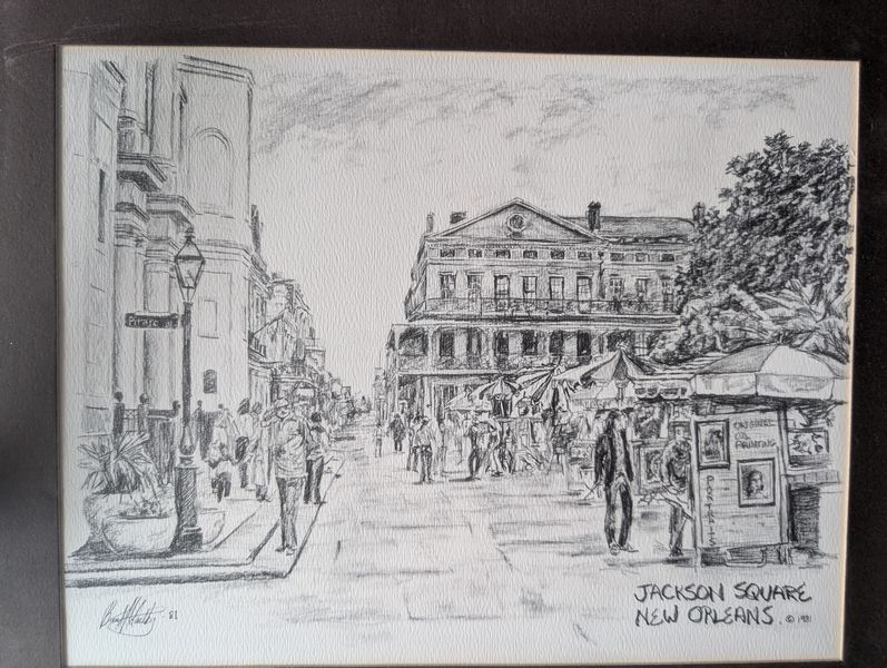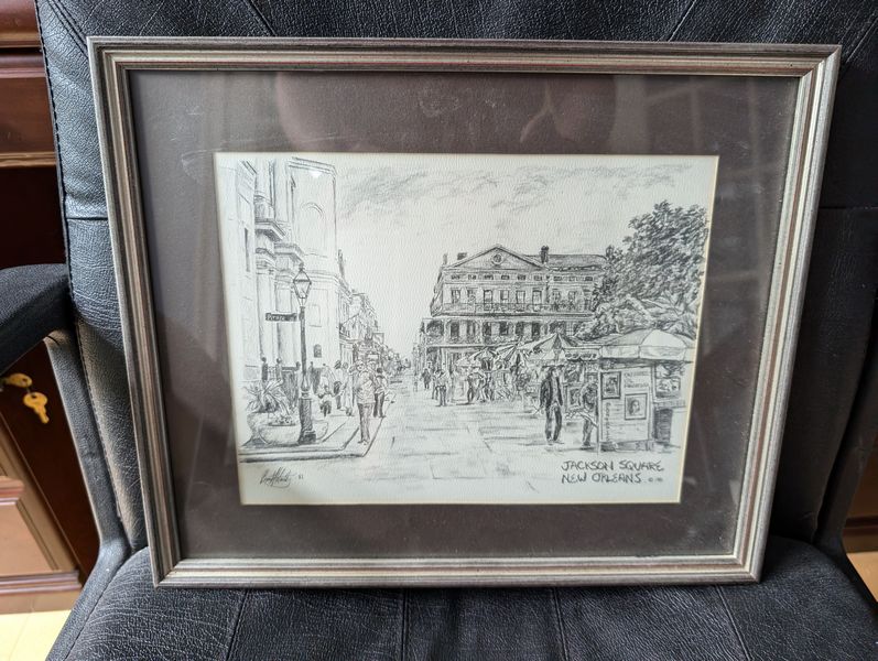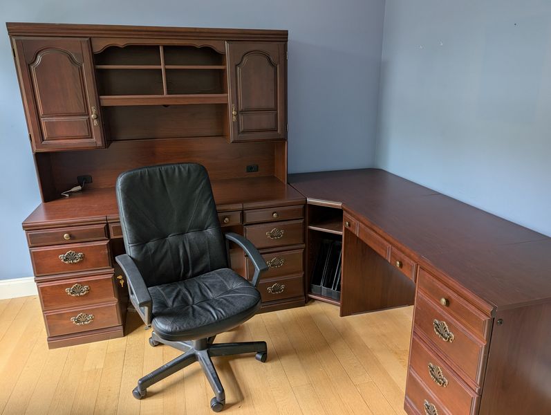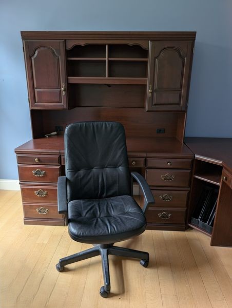 Palliser Office Furniture, Desk Chair, Art. L-shaped modular desk (5 pcs) incl: locking desk, 61.75"Wx27"Dx30"H w/ hutch, 39"H; corner unit req 32.75" on both sides; sm desk, 31.75"Wx27"Dx30"H; two-dr file cab, 16"Wx27"Dx30"H; vinyl desk chair (adj on casters), 25"Wx2'Dx40"H; signed wall of Jackson Square, New Orleans.