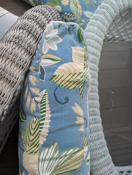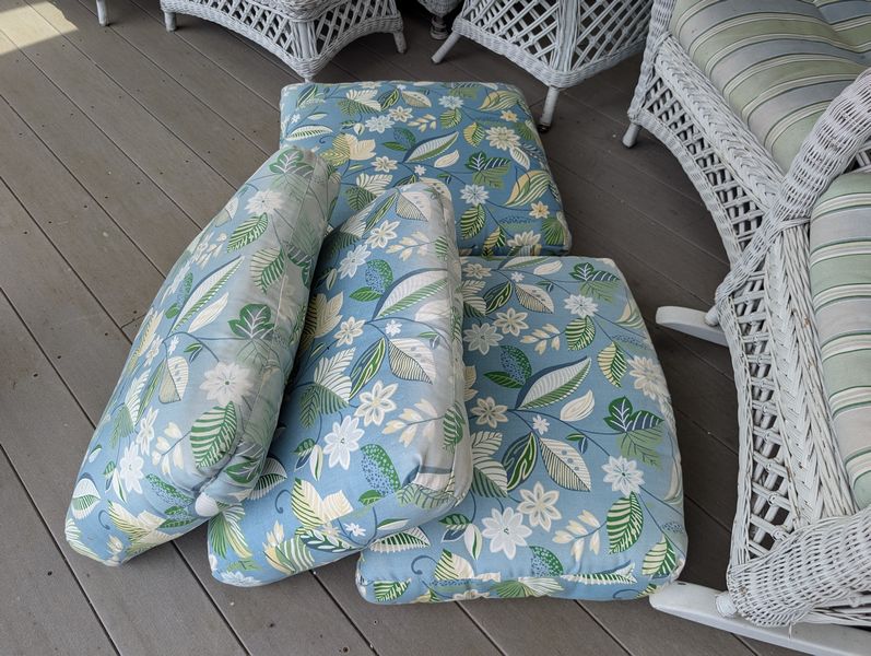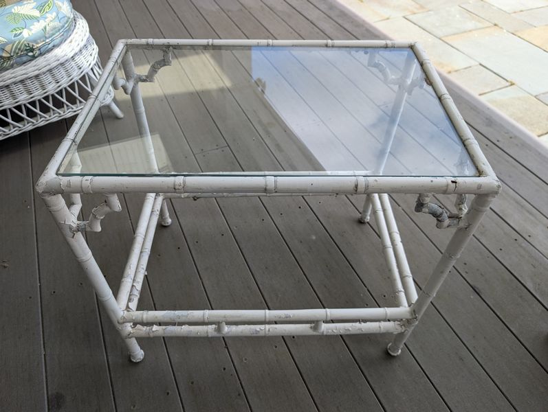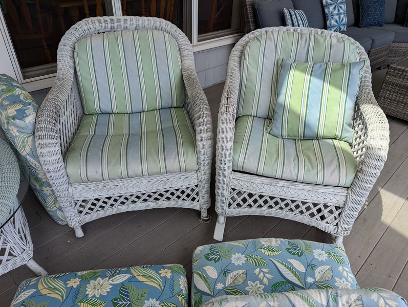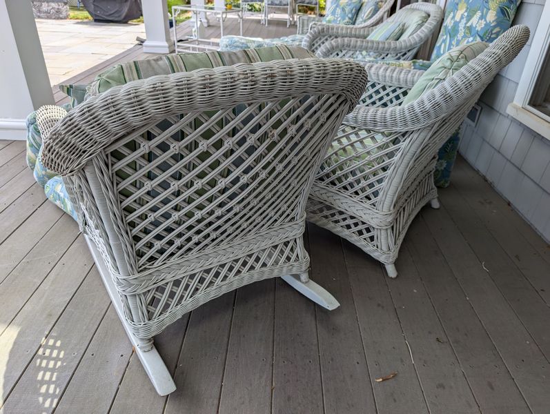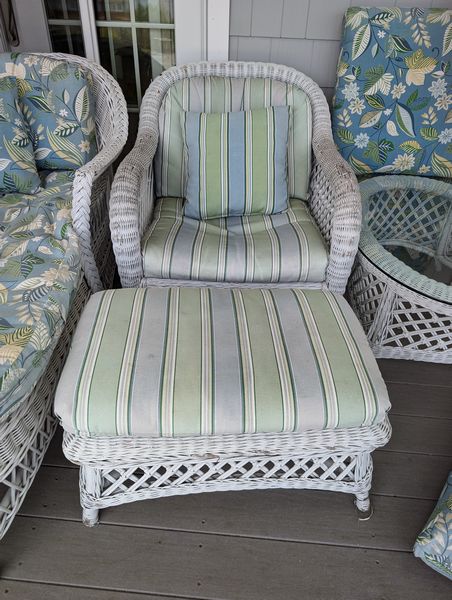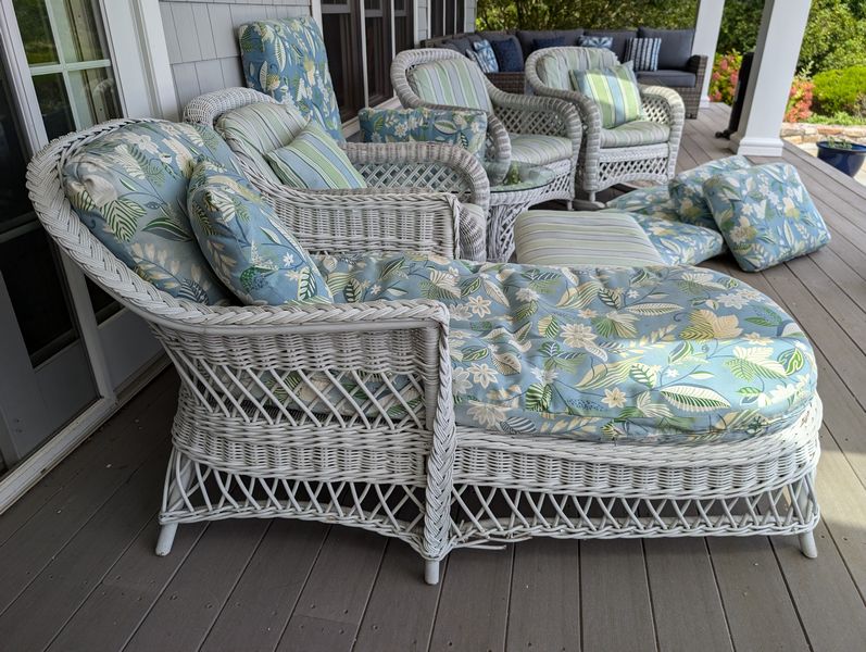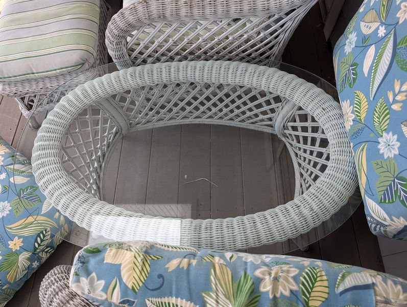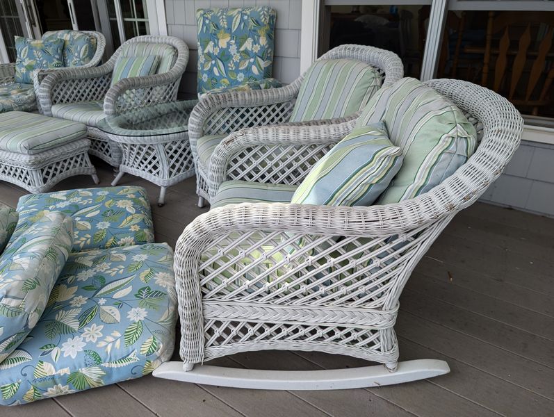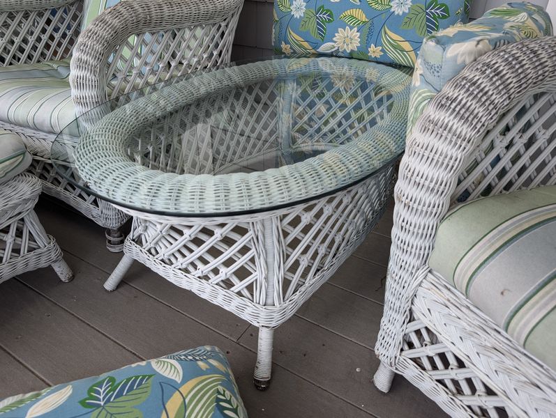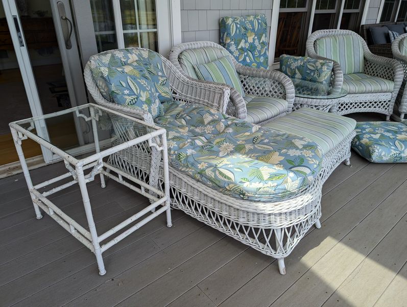 Antique Wicker Porch Furniture. Large lot antique white wicker furn (see damage/wear in photos to wicker and cushions) w/ some replacement cushions, incl: lounger, 5'Lx29.5"Wx33"H; pr armchairs, ea. 29"Wx33"D; one ottoman, 28"Wx18"Dx14"H; rocker, 29"Wx3'D; oval coffee table, 41.5"Lx27"Wx17"H. Also incl metal side table, 26"x18"x2'H w/ glass top (req scraping & painting). Loc outdoors under covered patio.