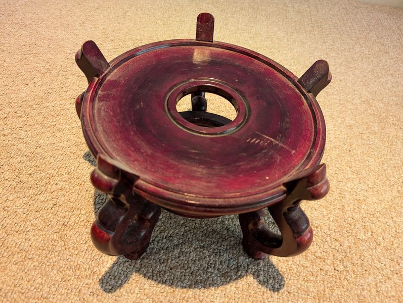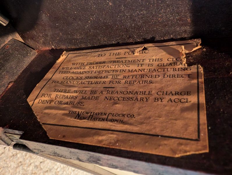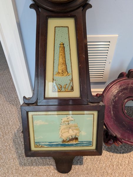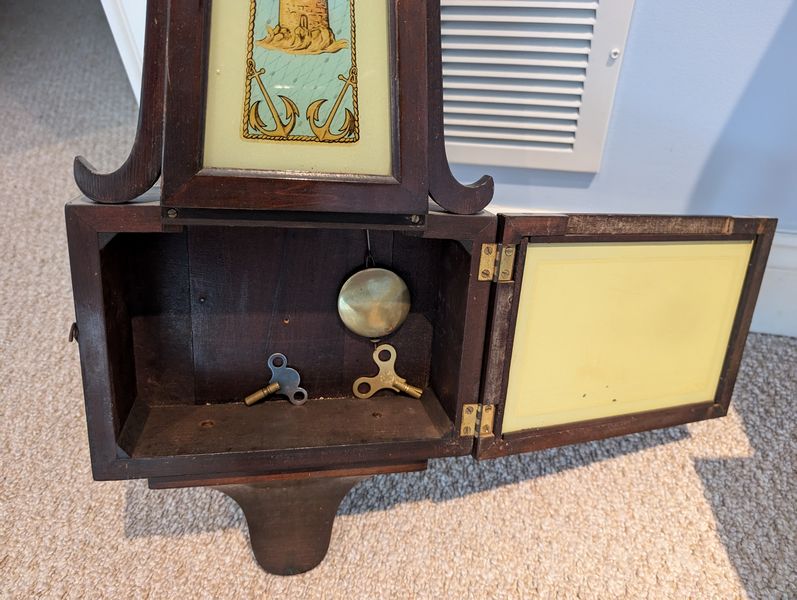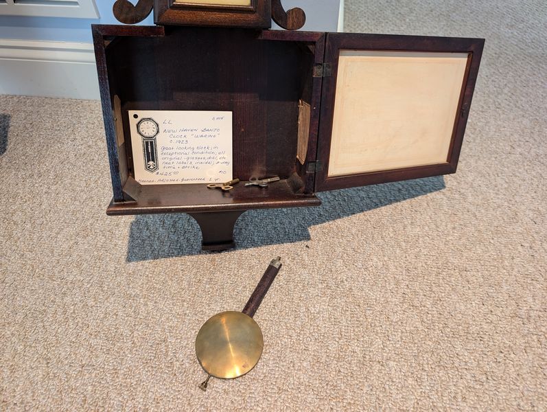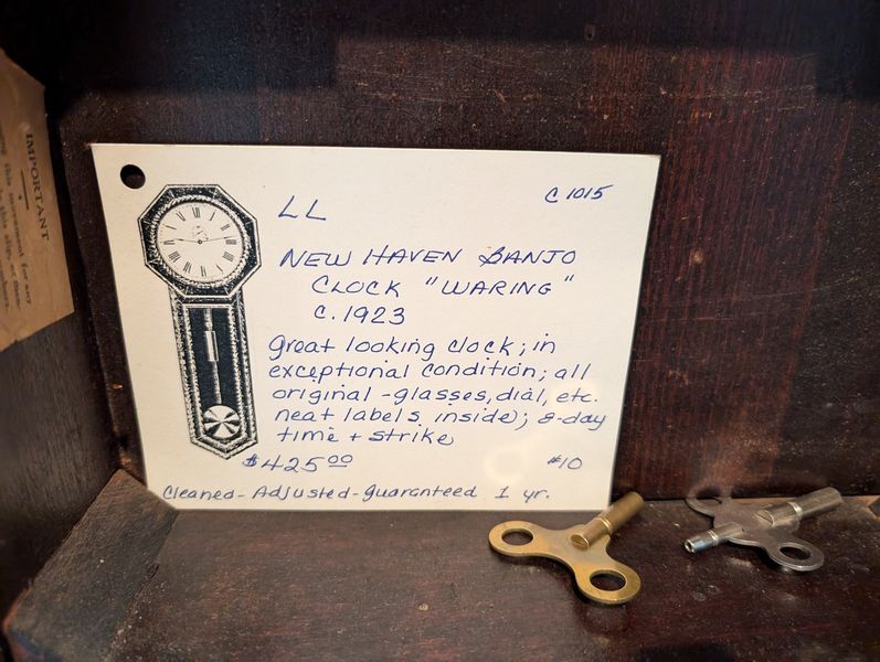 Antique Banjo Clocks, Plant Stand. One Sessions banjo-style wall clock w/ 6"diam face & brass pendulum w/ 2 keys, 35"L; one unmarked Waring antique banjo clock w/ 8"diam face, brass pendulum, keys & provenance (see photo), 38"L; wooden plant stand.