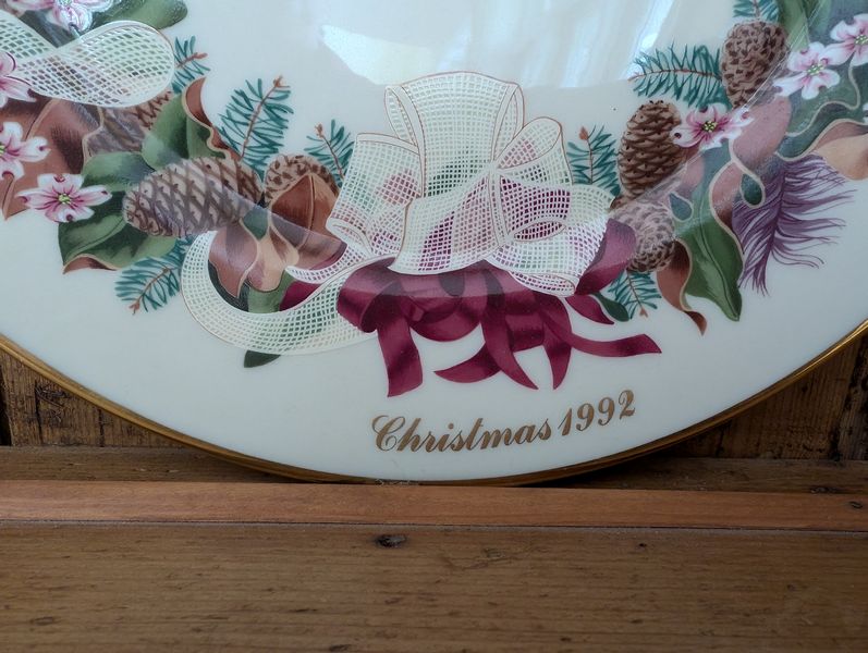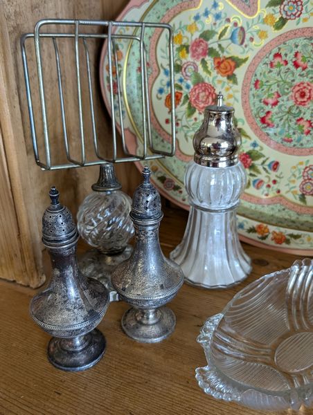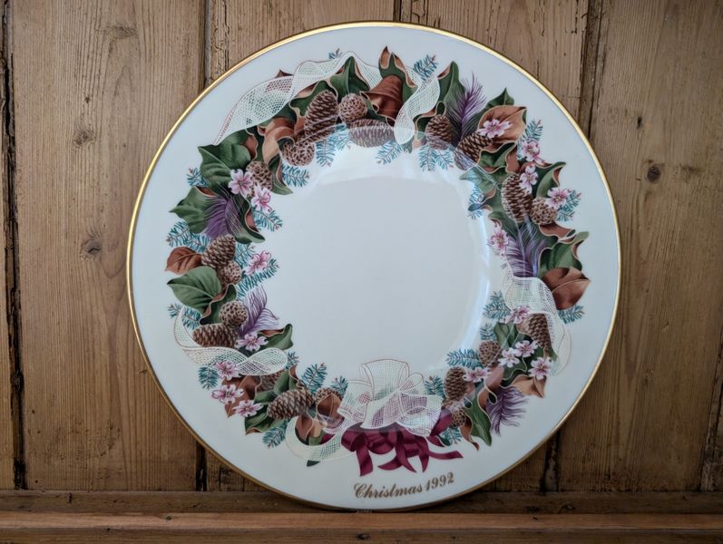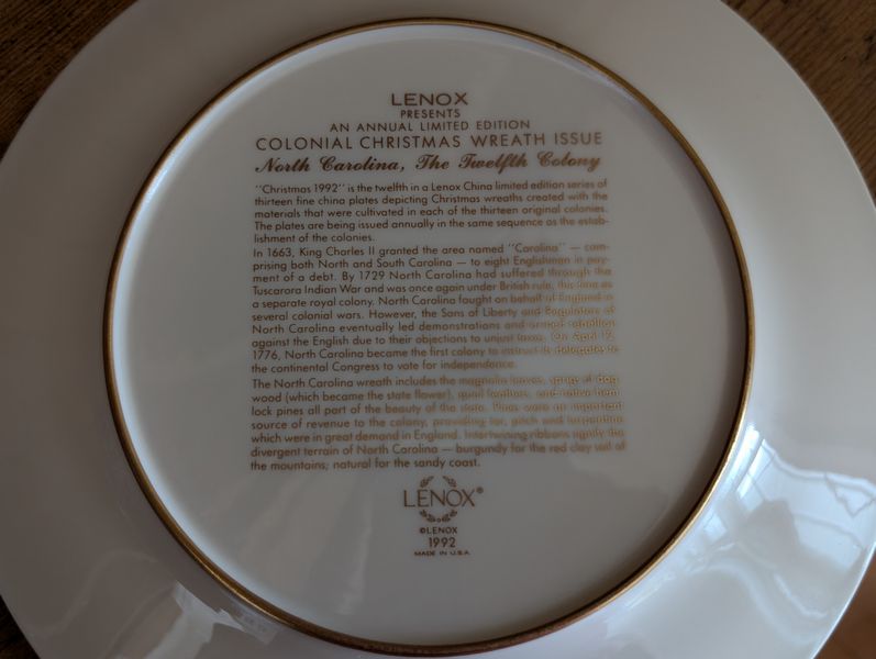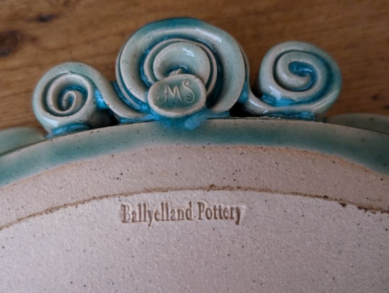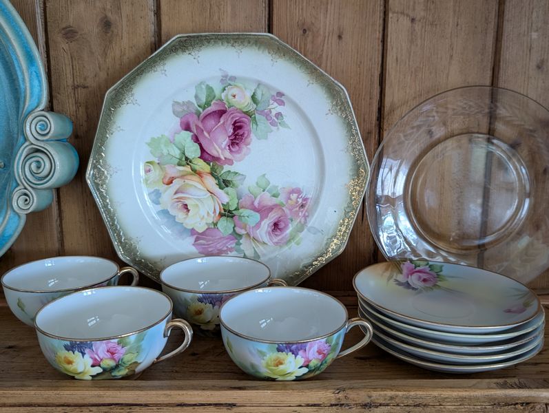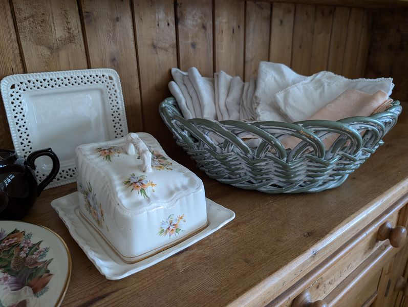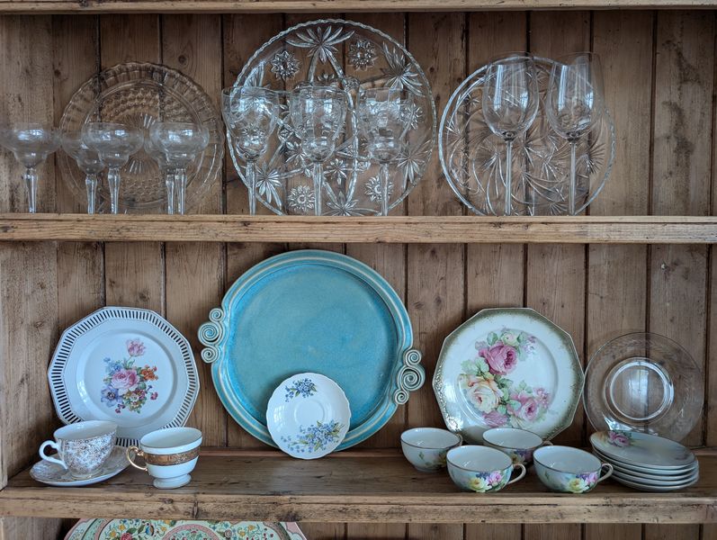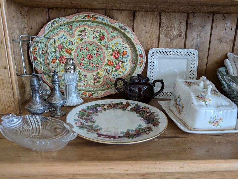 Vintage Entertaining. Hand made Ballyelland Pottery dbl-handled teal platter, 1'diam from Ireland; Lenox Christmas 1992 platter, 10.5"diam; Gibson Pottery dbl-handled covered crock from England; English tea cups & saucers; vintage stemware & linens; sterling S&P; other items seen in photos. Furniture incl in lot #6.