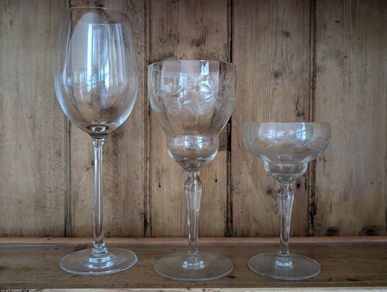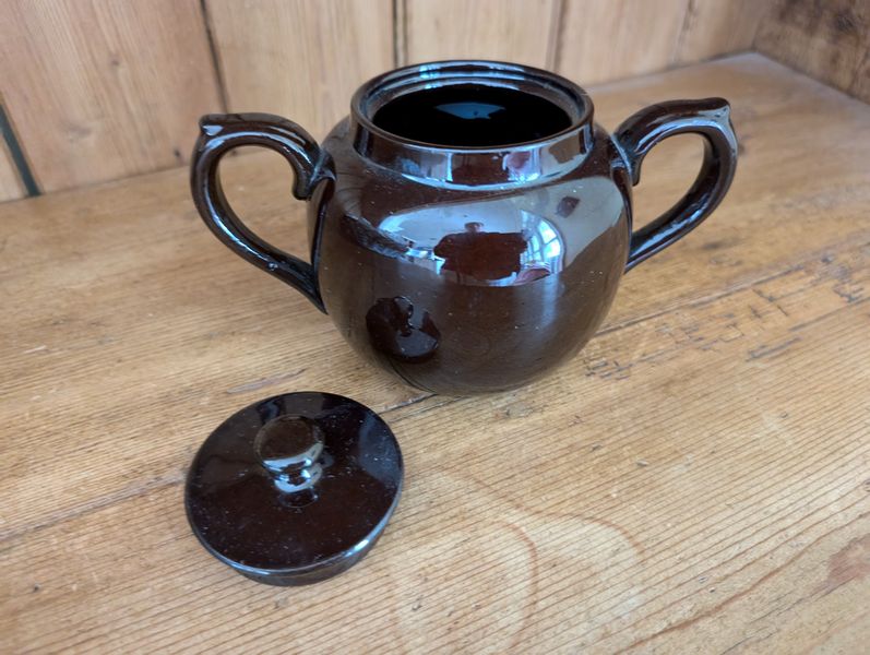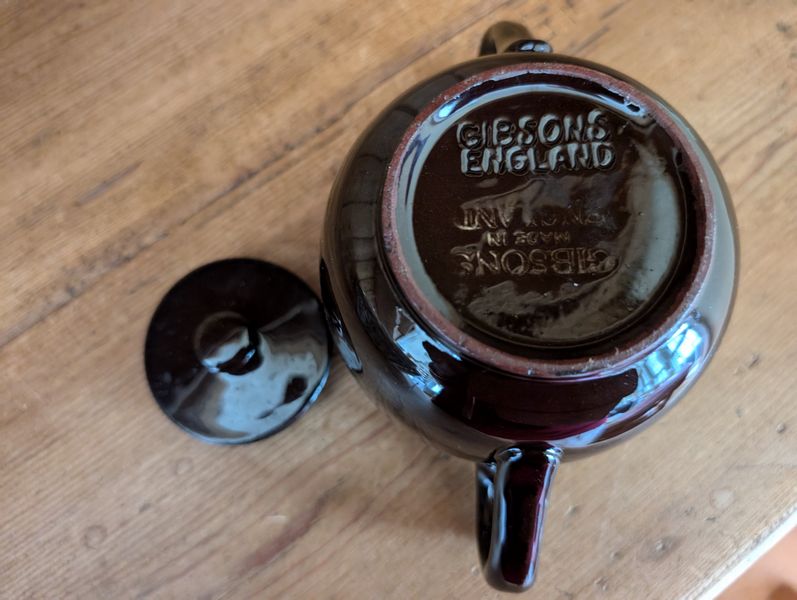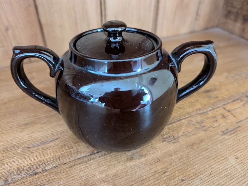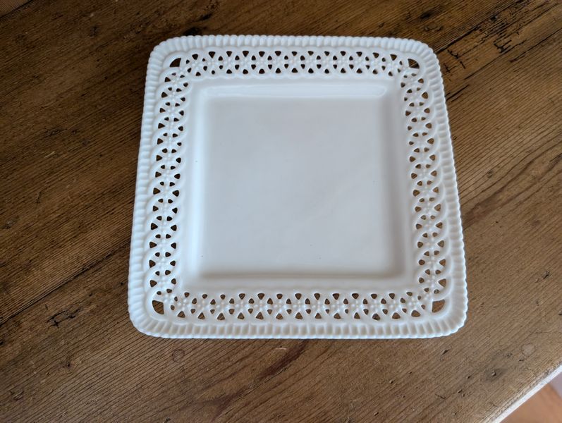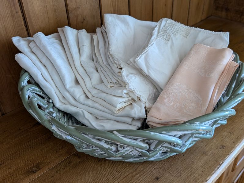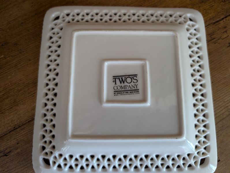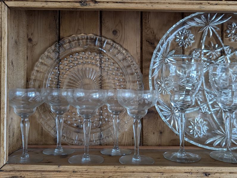 Vintage Entertaining. Hand made Ballyelland Pottery dbl-handled teal platter, 1'diam from Ireland; Lenox Christmas 1992 platter, 10.5"diam; Gibson Pottery dbl-handled covered crock from England; English tea cups & saucers; vintage stemware & linens; sterling S&P; other items seen in photos. Furniture incl in lot #6.