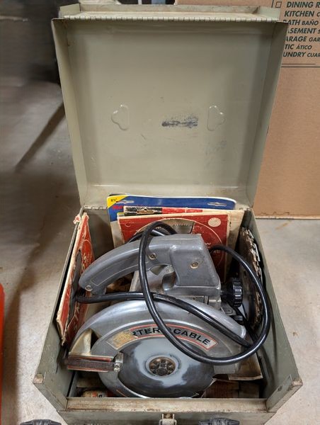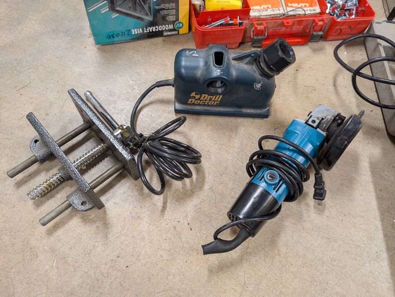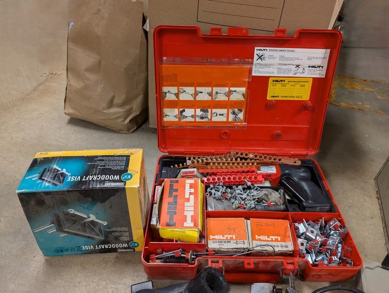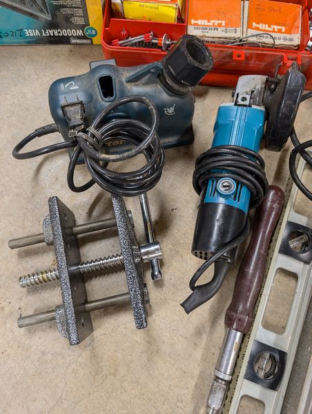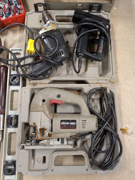 Electric Hand Tools. Porter-Cable circular saw; power Skil drill; Black & Decker elec stapler; Porter-Cable hand jig saw; elec grinder; modern vice; Hilti piston drive tool (in case); Drill Doctor tool; level; screwdriver. Loc in basement.