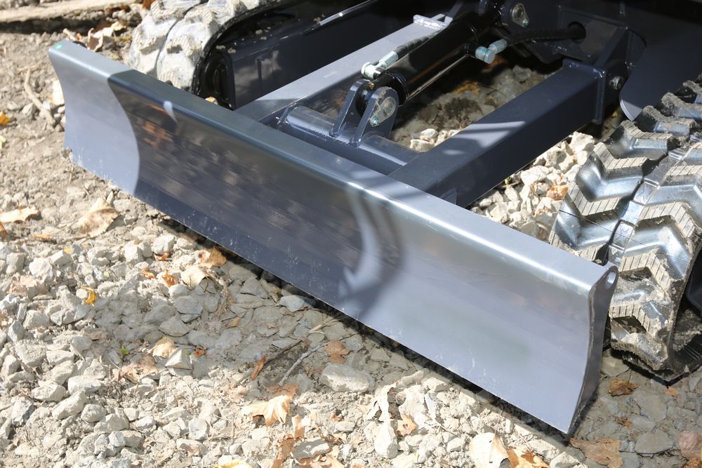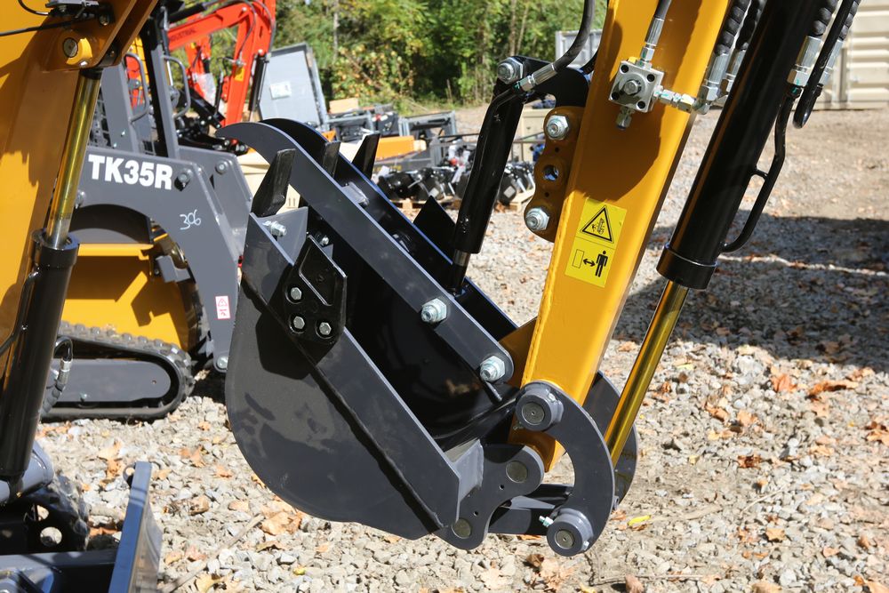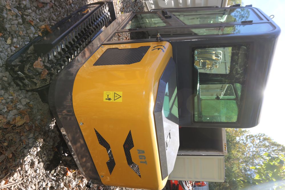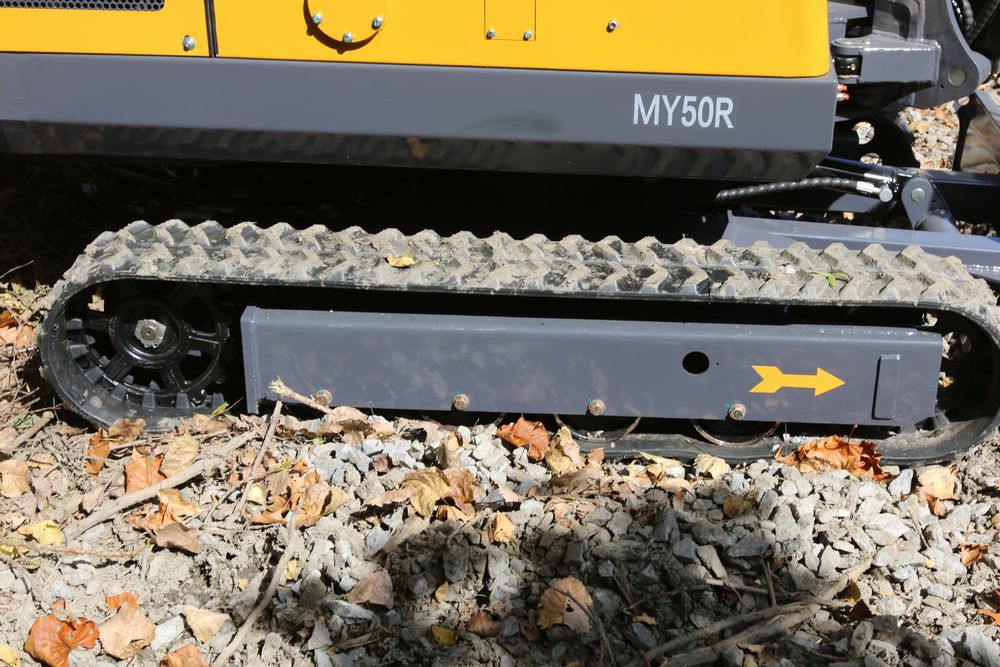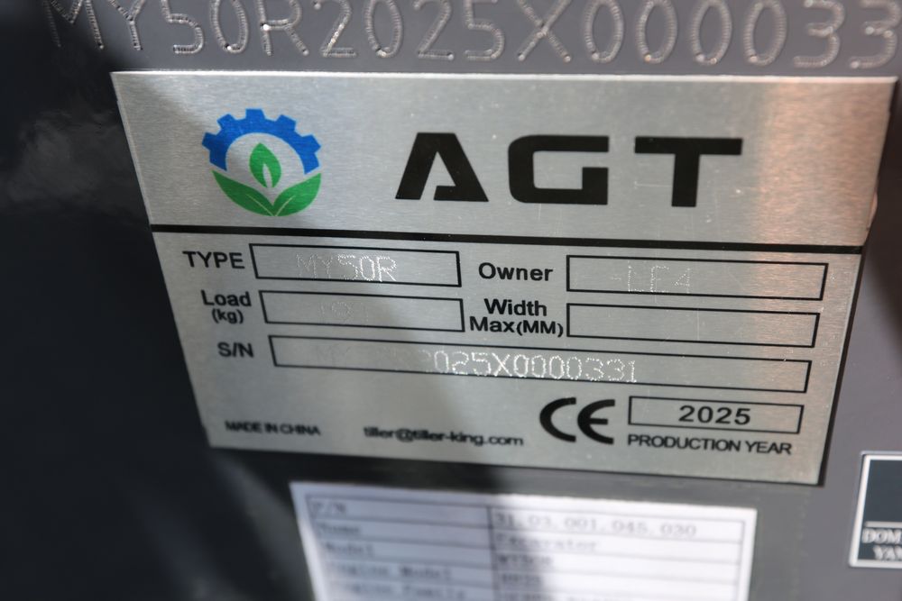 ATG Industrial MY50R mini excavator with a 1900 kg load. Features include a R825 engine model, enclosed cab, a hydraulic thumb, and off-road undercarriage expansion. Includes a dozer blade, tracked base, and ergonomic operator seat. Less than 1 hour of use.