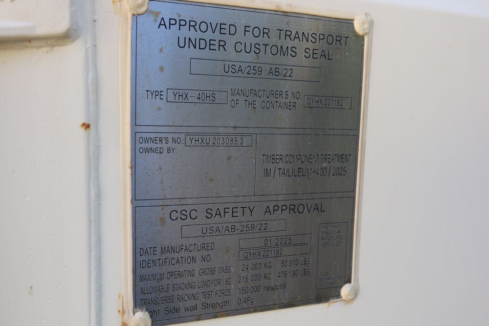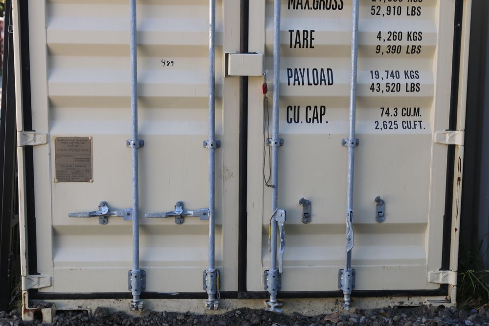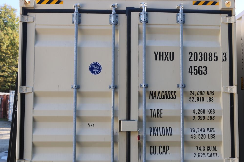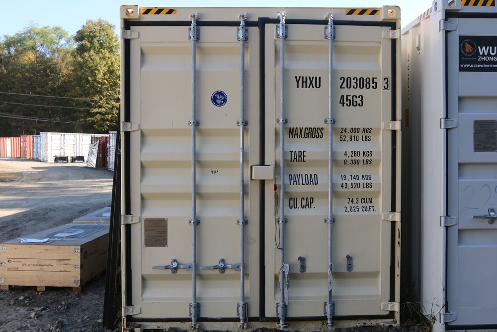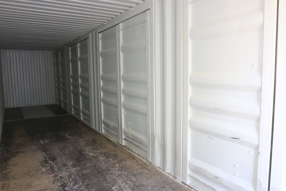 40' High cube multi-door container, four side doors, one end door, side forklift pockets.