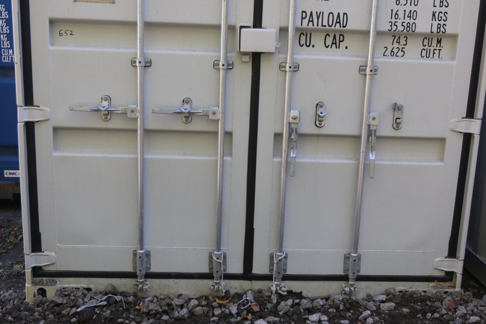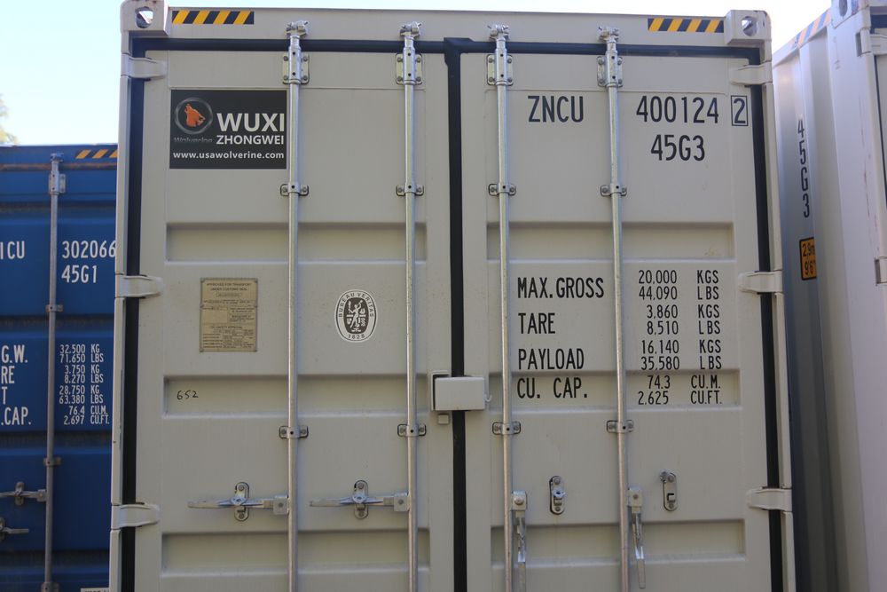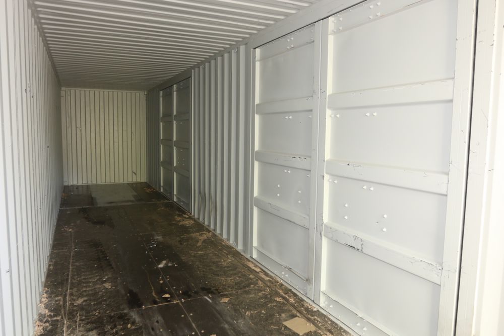 40' High cube multi-door container, two side doors, one end door, side forklift pockets.