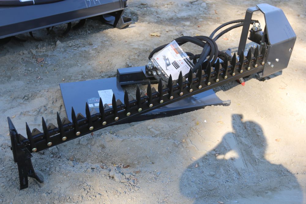 Wolverine Skid steer sickle bar mower attachment, model SBM-12-72W, 1" cutting capacity, 72" cutting length, blade swing of +90 degrees -30 degrees.