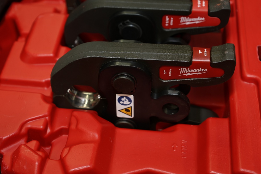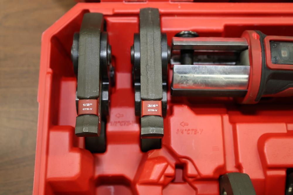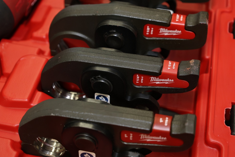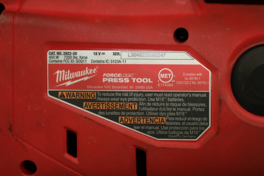 Milwaukee M18 FORCELOGIC Press Tool, model 2922-20, rated at 450 watts and 7200 lbs. of force. The unit operates on an 18 V system and is shown with serial number L38A9225606247. Set includes six CTS-V press jaws in ½ in., ¾ in., 1 in., 1 ¼ in., 1 ½ in., and 2 in. sizes, all housed in the original molded Milwaukee carrying case. Designed for pressing copper and stainless fittings in plumbing and mechanical applications. Does not include battery or charger.