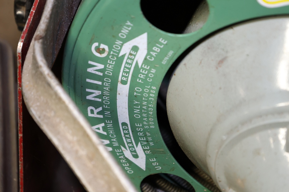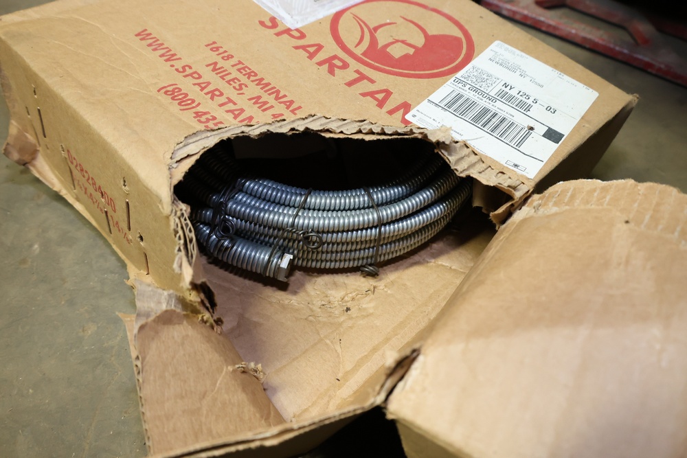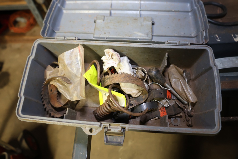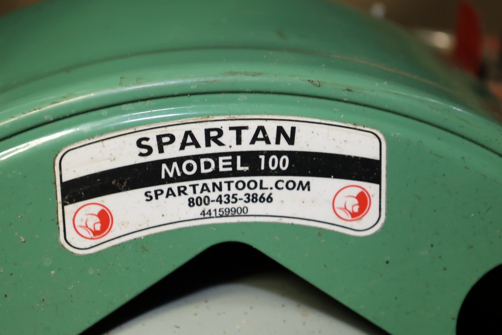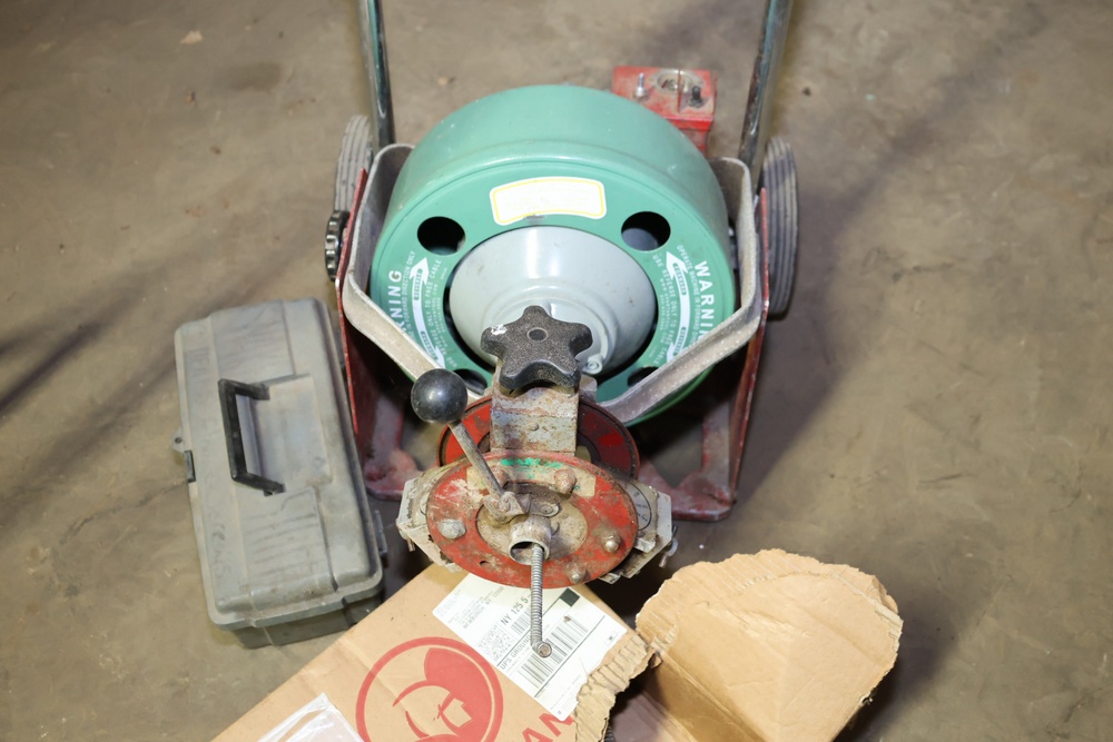 Spartan model 100 drain cleaning machine with accessory parts box and spare cable. Manufactured by Spartan Tool, Niles, Michigan. The unit features a wheeled frame with reel housing and foot-operated controls for safe operation. The included parts box contains assorted cutting heads, blades, springs, and small hardware. Also includes a boxed replacement cable assembly for use with the Spartan 100, designed for clearing small to medium-diameter plumbing lines.