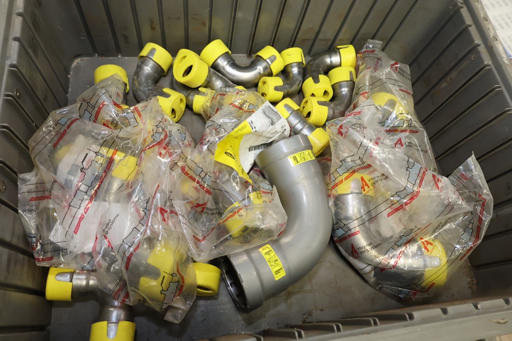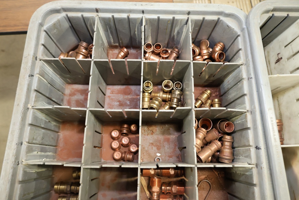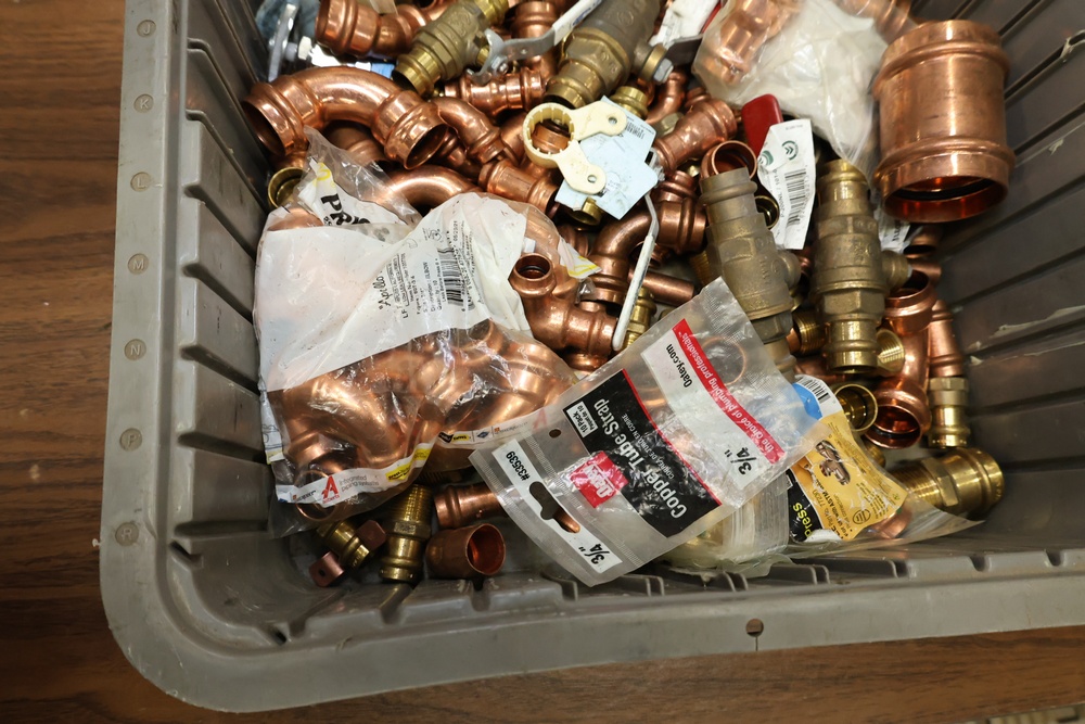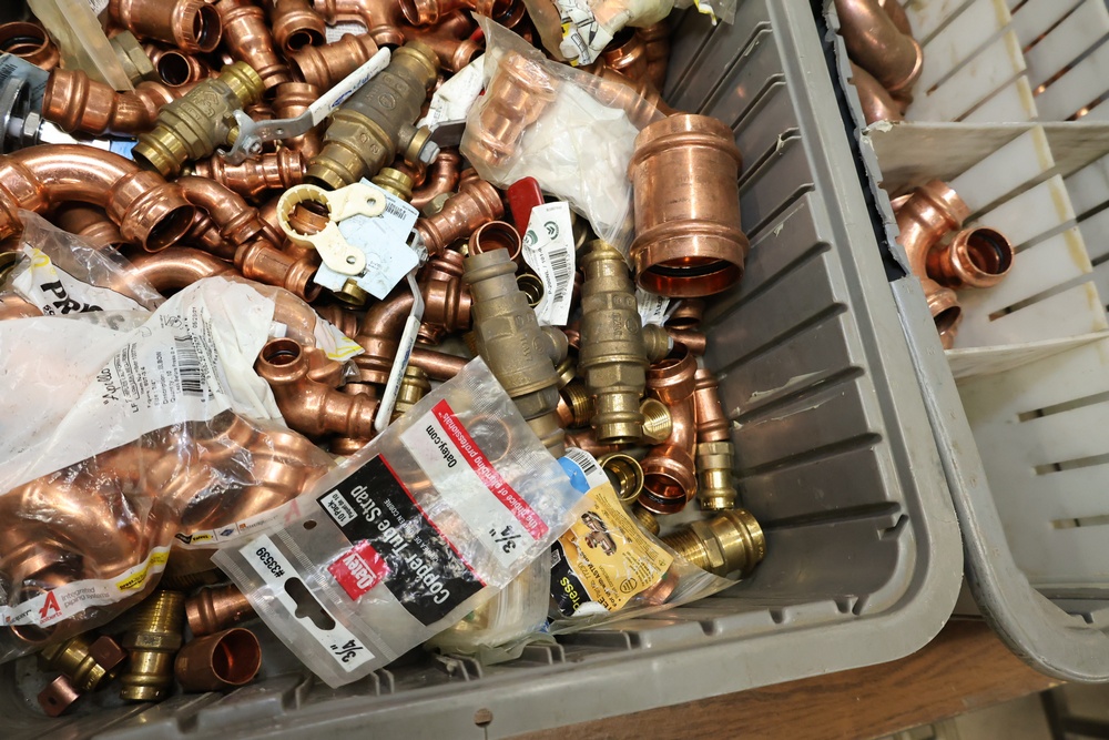 Assorted plumbing fittings and connectors in multiple storage bins. Contents include copper press fittings such as elbows, tees, couplings, and adapters in various diameters, along with brass threaded fittings and caps. Also included are steel gas press fittings by Apollo PowerPress, model PWR7481441, 1-1/4" size with VSH technology. Lot contains both loose and packaged components suitable for HVAC, plumbing, and gas piping installations.
