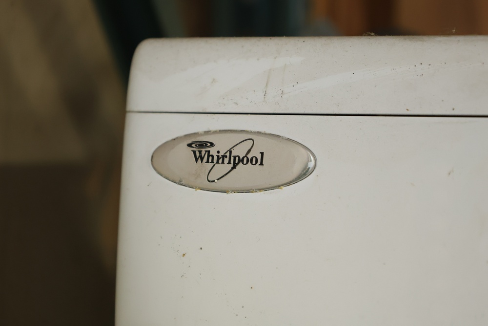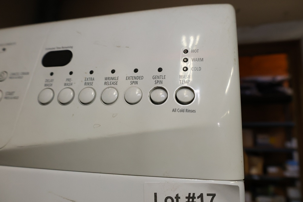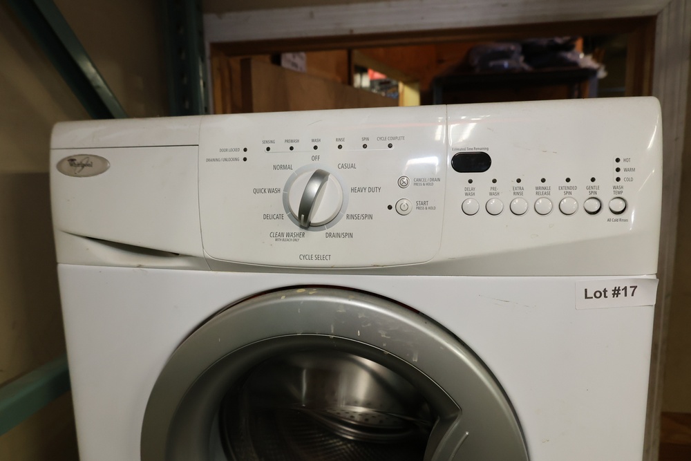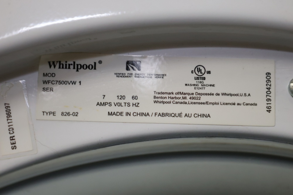 Whirlpool front-loading washing machine, model WFC7500VW1, designed for residential laundry use. The unit operates at 7 amps, 120 volts, and 60 Hz, and is UL listed under type 118G. It includes multiple cycle selections such as Normal, Casual, Heavy Duty, and Delicate, along with additional features including Delay Wash, Extra Rinse, and temperature control options. Type number is 826-02.