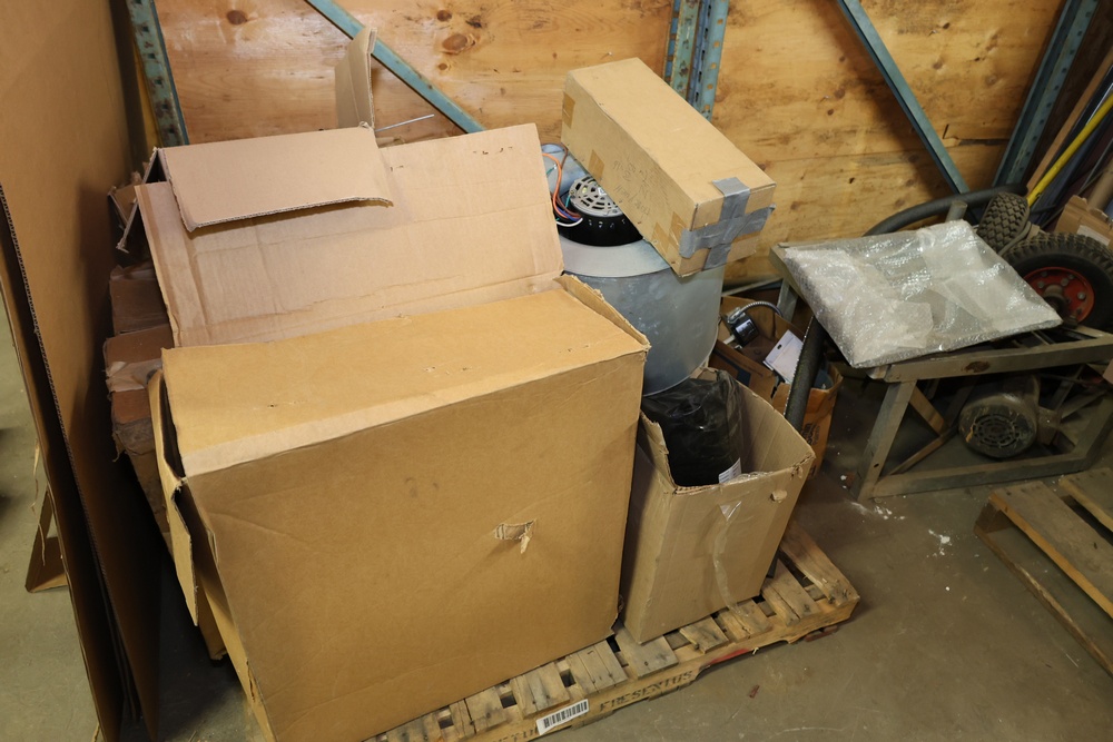 HVAC components and portable air conditioning units. Notable items include a Fedders portable air conditioner, model AP09S2BCOM, rated at 9,000 BTU with 115V input, serial number DT860960. Also included is a Reznor hydronic unit heater, a window-mount air conditioner, and an open boxed heating element assembly labeled model HKSC05XCBA with visible wiring and coil elements. Additional components include a FIR S.p.A. AC motor, model WSE0/85, rated at 0.248 HP, 115V, 1050/1600 RPM, and a centrifugal blower fan in open packaging. Buyer must take all.