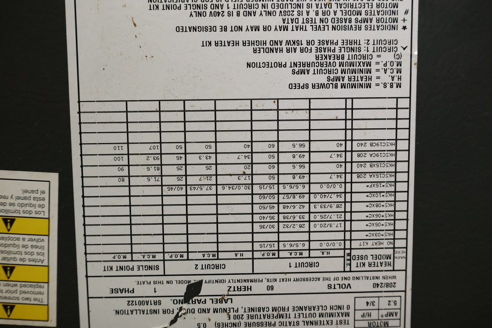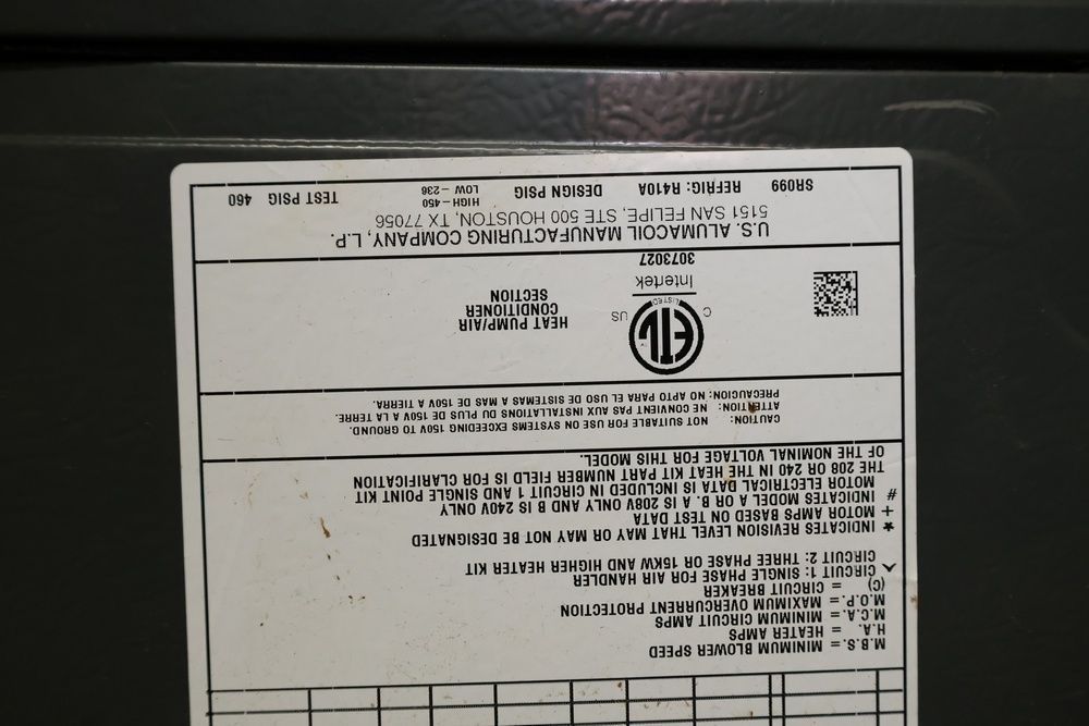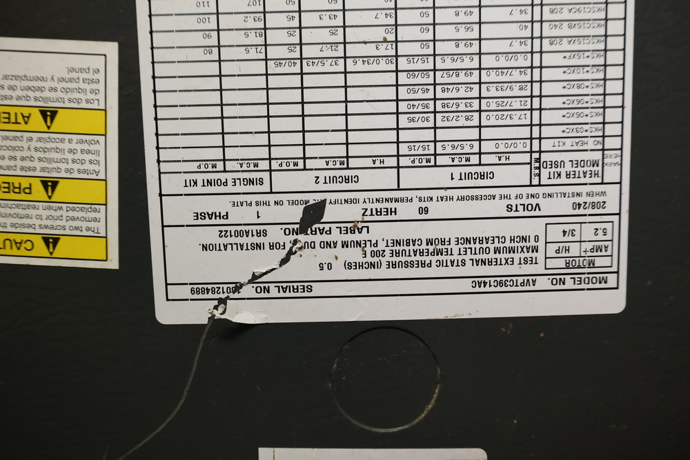 Amana model AVPTC39C14AC variable-speed air handler with integrated coil assembly. Manufactured by U.S. Amana Manufacturing Company, Houston, Texas. Rated for 208/240V single-phase, 60 Hz operation with a maximum external static pressure of 0.5 in. w.c. Unit includes integrated control board, multi-position cabinet, and electric heater kit.