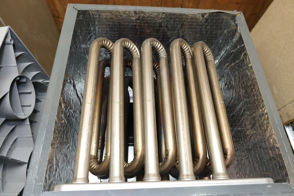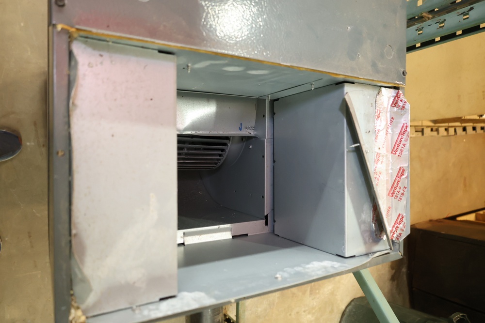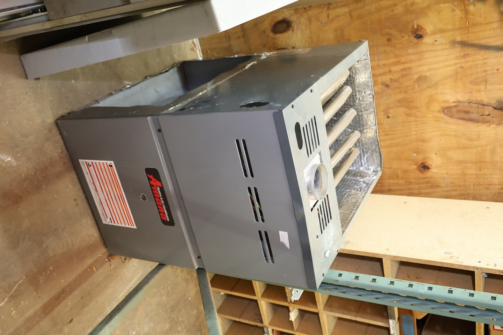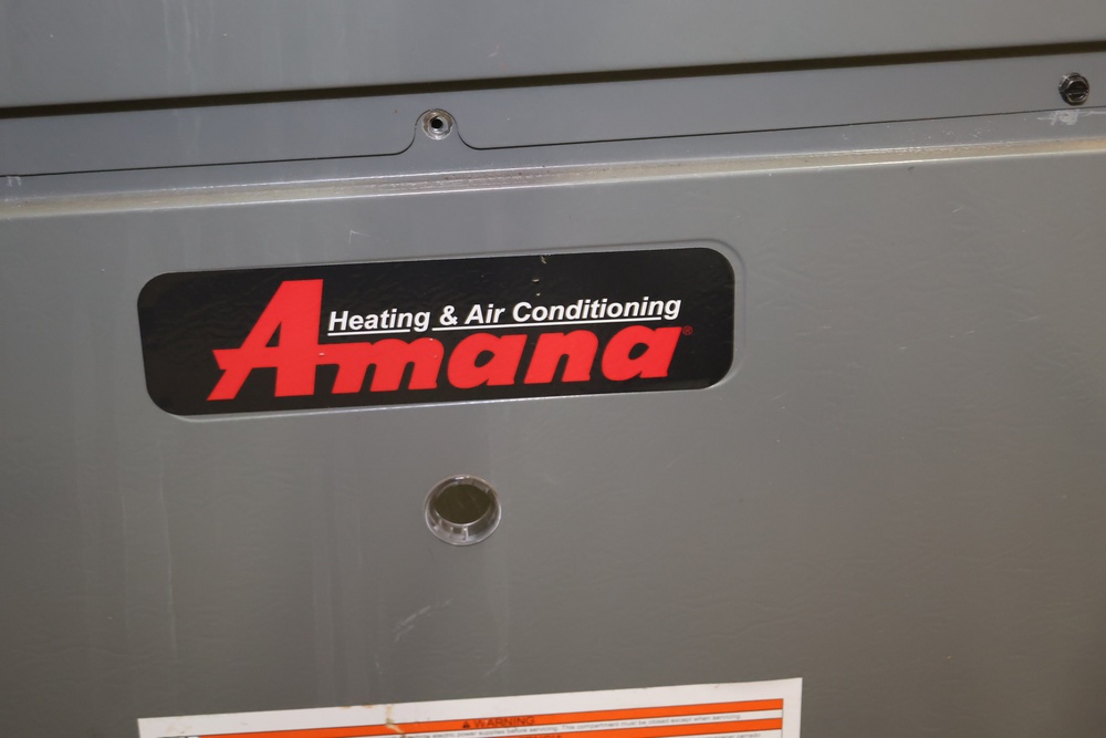 Amana gas-fired unit heater, model not specified. Horizontal discharge design with tubular heat exchanger and flue collar for vented operation. Designed for suspended or elevated mounting in commercial or industrial spaces.