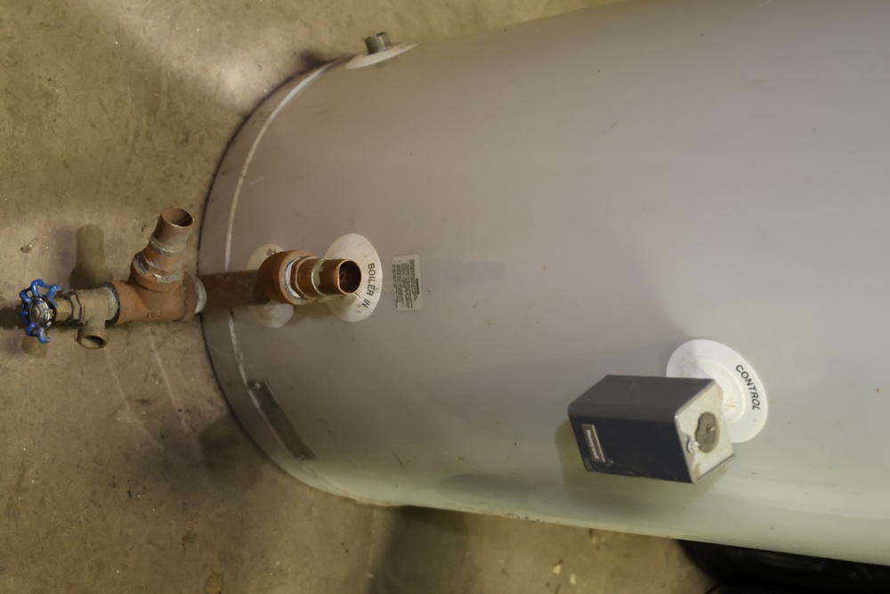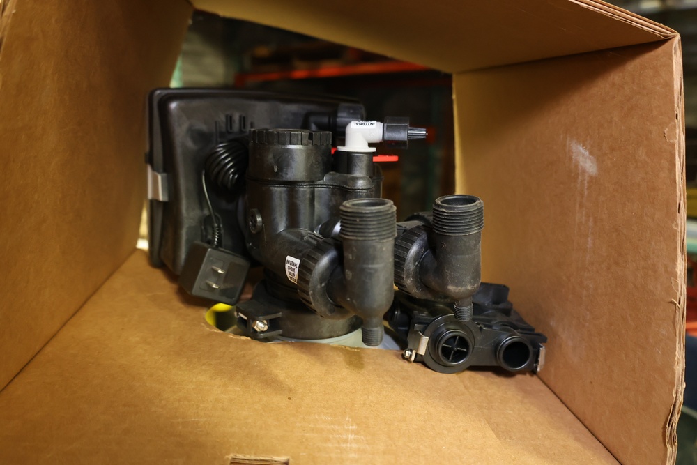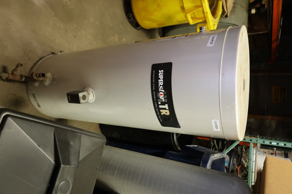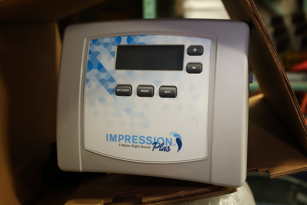 Superstor model SSU-45 stainless steel indirect fired water heater, manufactured 12/27/2005, with NSF certification and UL listing. Includes Water-Right Impression Plus water conditioning system consisting of mineral tank, brine tank, and digital control head. The digital controller provides programmable regeneration cycles and clock-based operation. No additional media, plumbing components, or accessories are included beyond those shown.