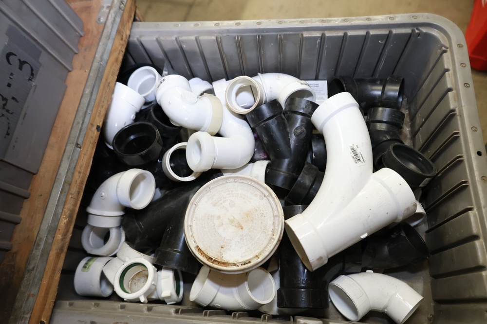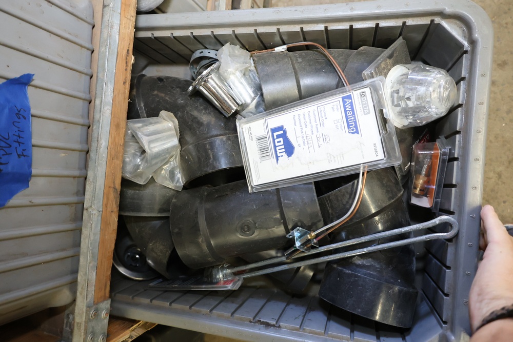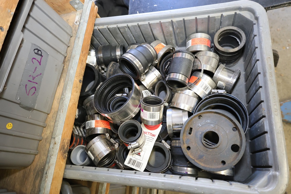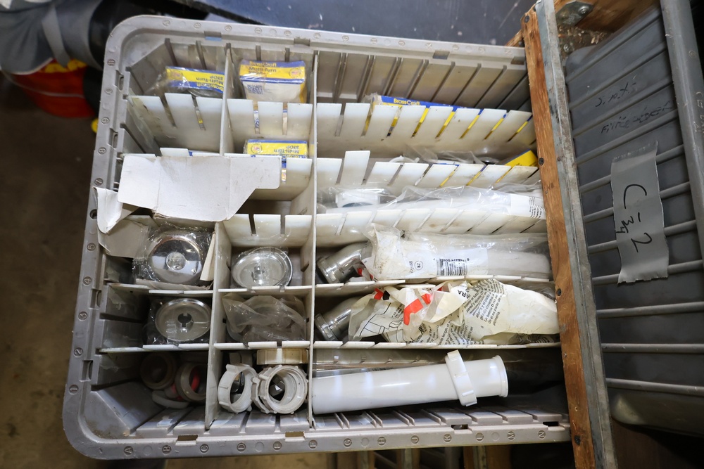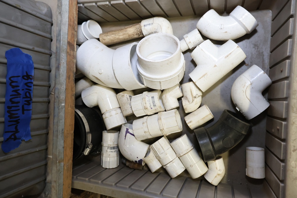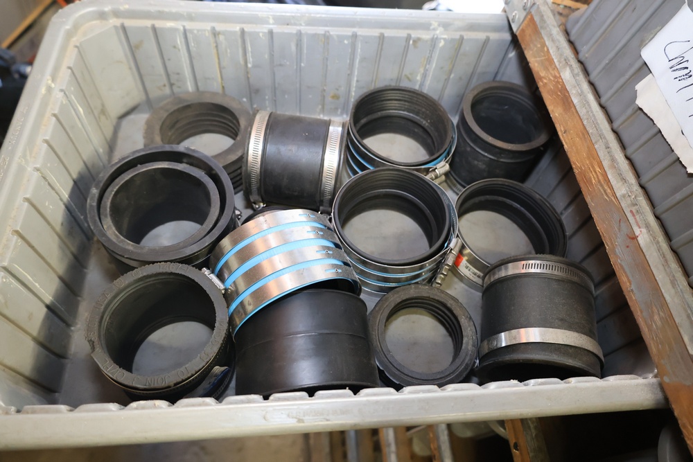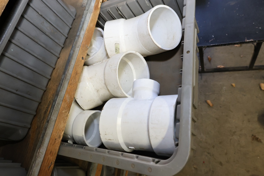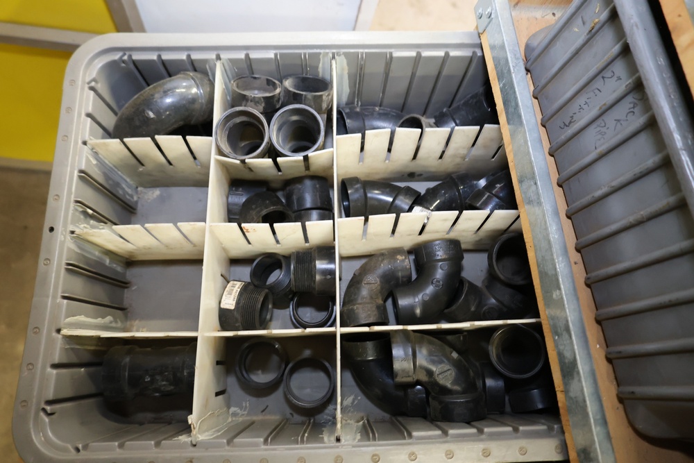 Four shelving units containing approx. 40 labeled plastic bins filled with assorted plumbing and mechanical components. Contents include PVC, ABS, and copper pipe fittings in various sizes and configurations, rubber couplings with stainless steel clamps, electrical boxes, pipe adhesives, valves, and related hardware. The lot also includes the shelving structure and all storage containers as shown. Buyer must take all.