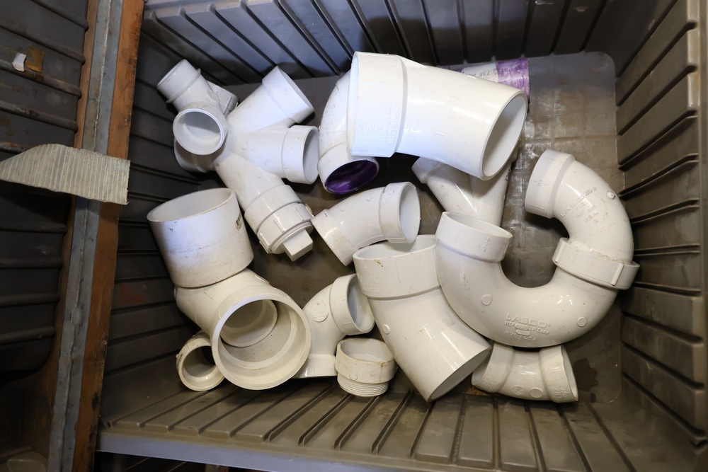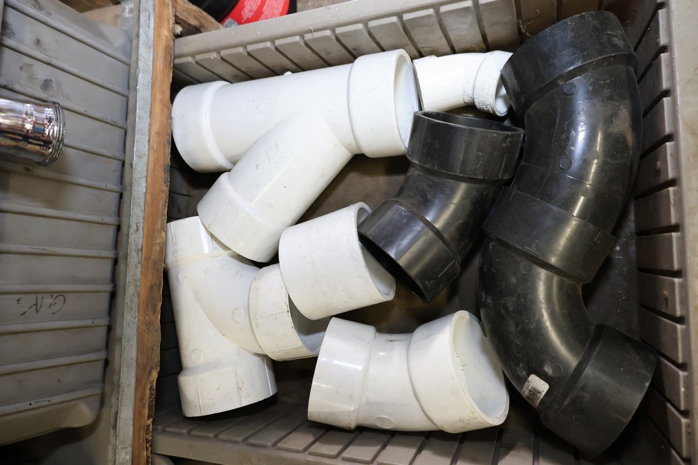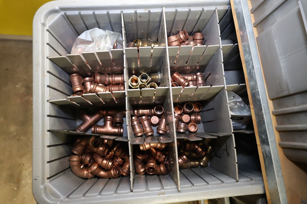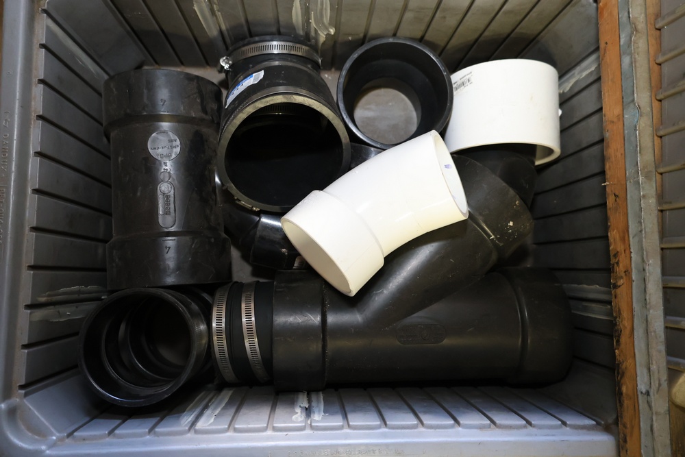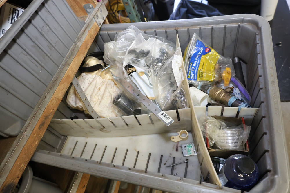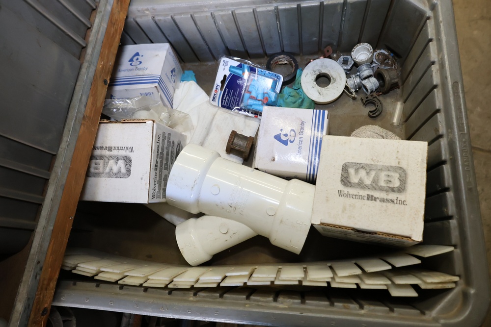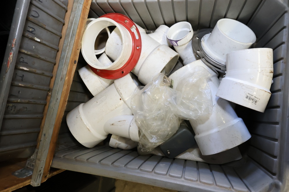 Four shelving units containing approx. 40 labeled plastic bins filled with assorted plumbing and mechanical components. Contents include PVC, ABS, and copper pipe fittings in various sizes and configurations, rubber couplings with stainless steel clamps, electrical boxes, pipe adhesives, valves, and related hardware. The lot also includes the shelving structure and all storage containers as shown. Buyer must take all.
