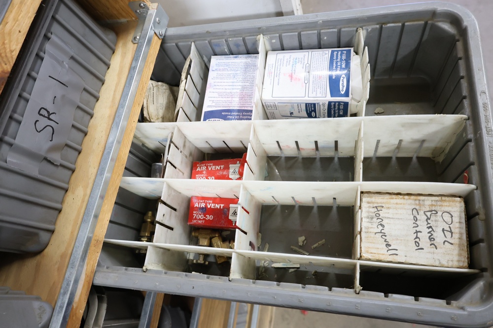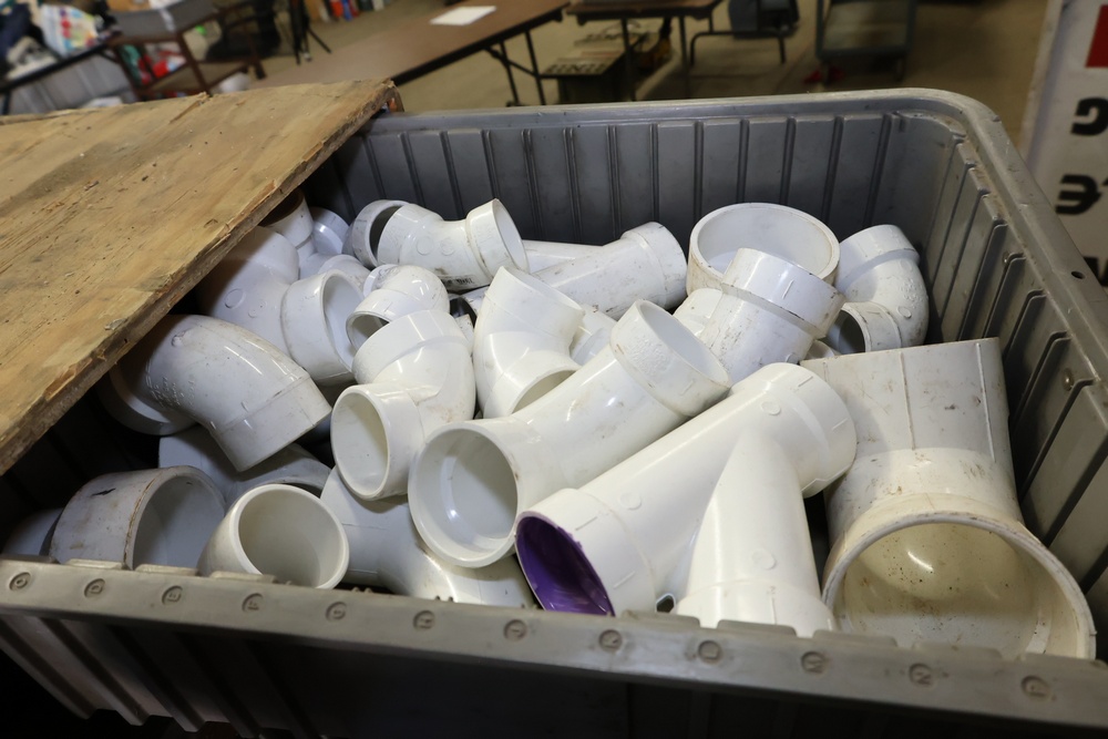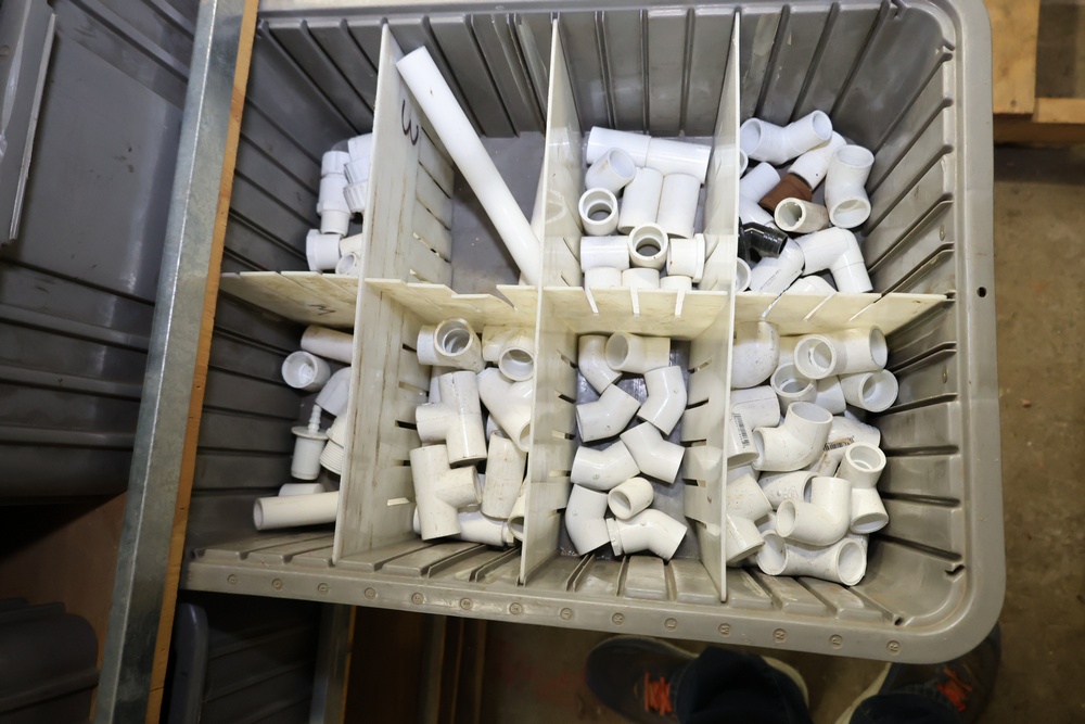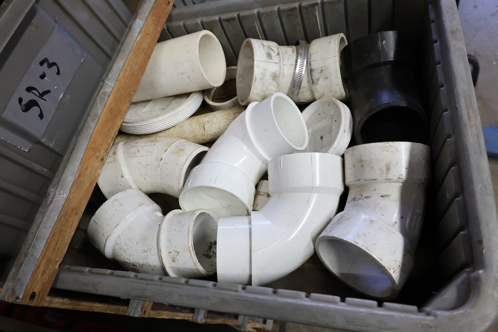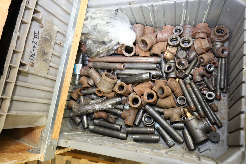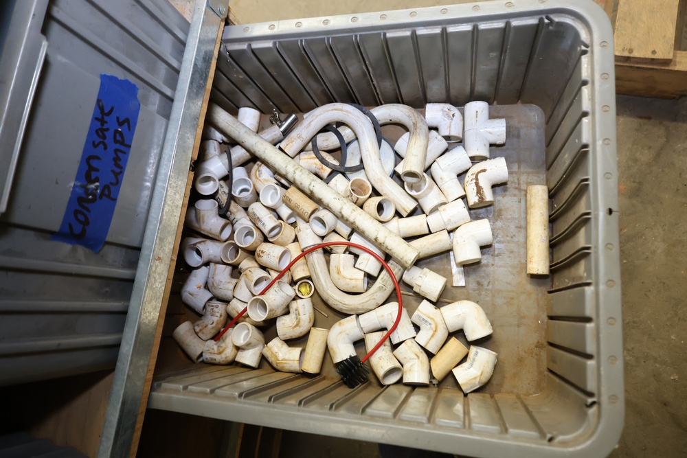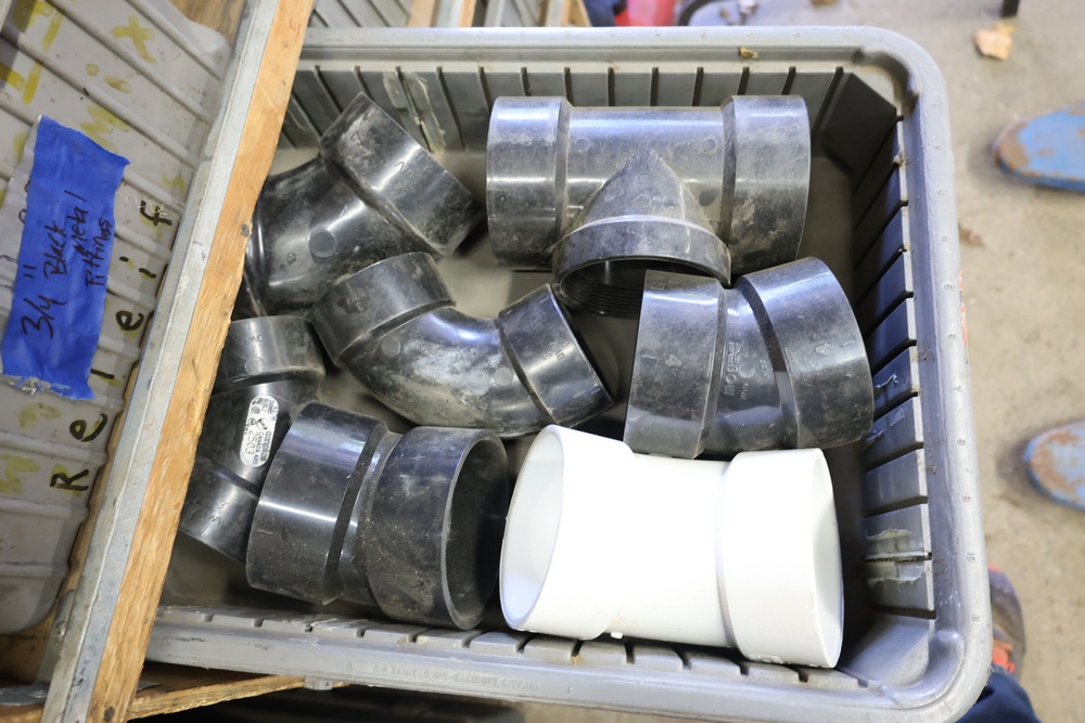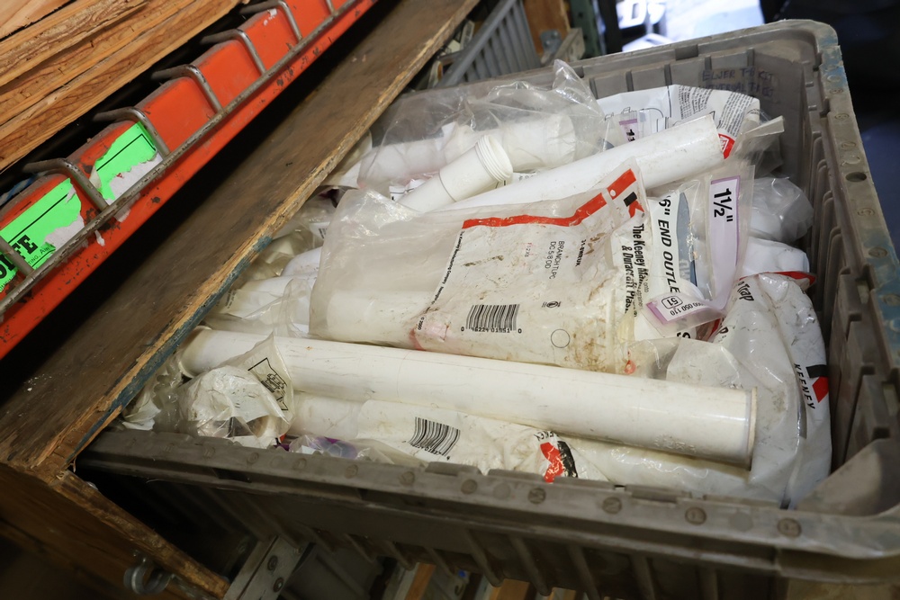 Four shelving units containing approx. 40 labeled plastic bins filled with assorted plumbing and mechanical components. Contents include PVC, ABS, and copper pipe fittings in various sizes and configurations, rubber couplings with stainless steel clamps, electrical boxes, pipe adhesives, valves, and related hardware. The lot also includes the shelving structure and all storage containers as shown. Buyer must take all.