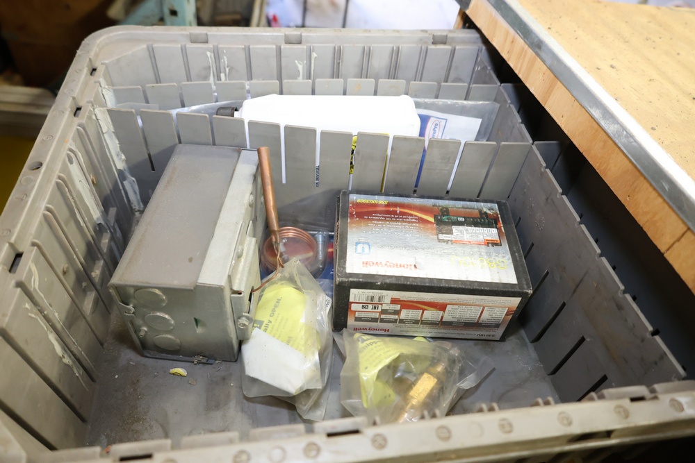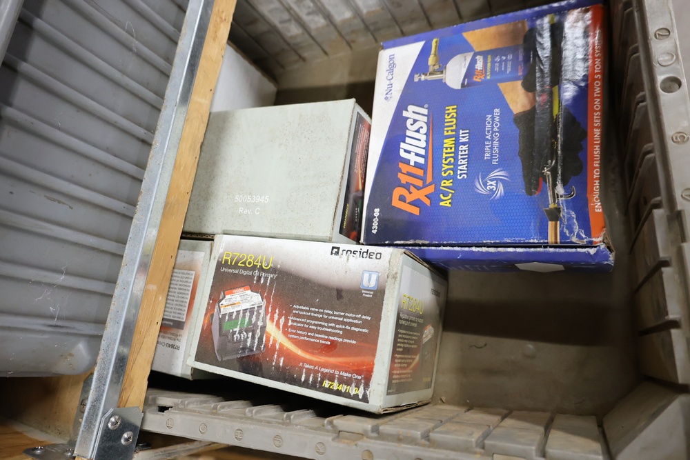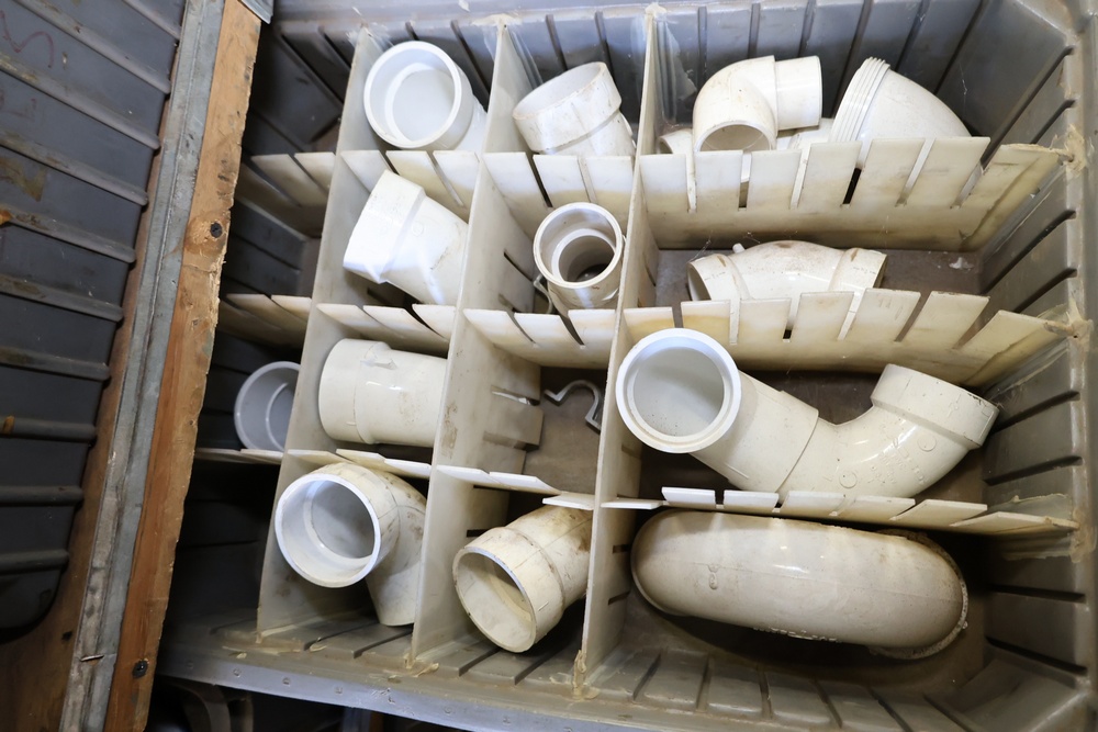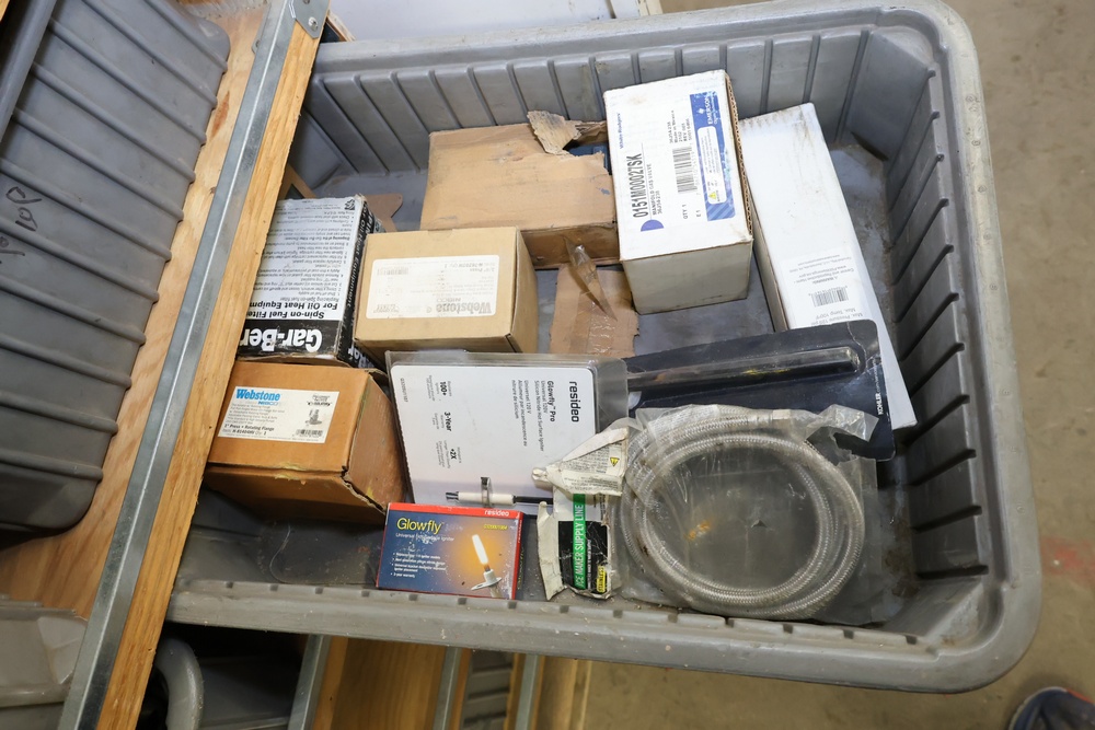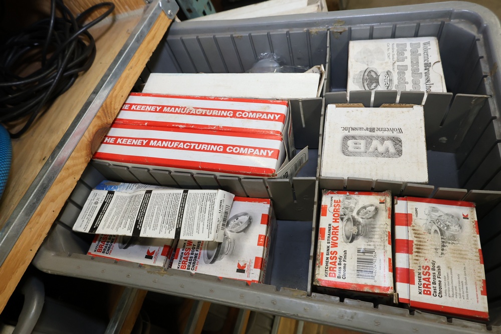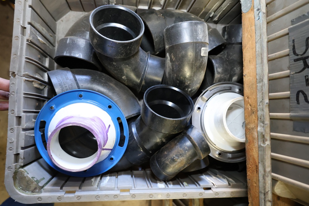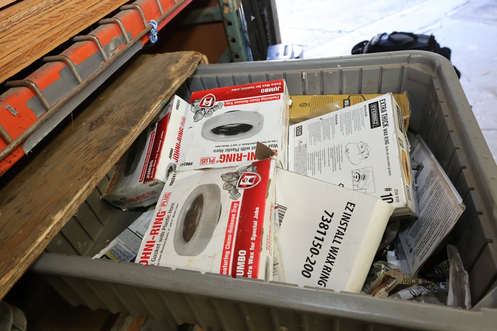 Four shelving units containing approx. 40 labeled plastic bins filled with assorted plumbing and mechanical components. Contents include PVC, ABS, and copper pipe fittings in various sizes and configurations, rubber couplings with stainless steel clamps, electrical boxes, pipe adhesives, valves, and related hardware. The lot also includes the shelving structure and all storage containers as shown. Buyer must take all.