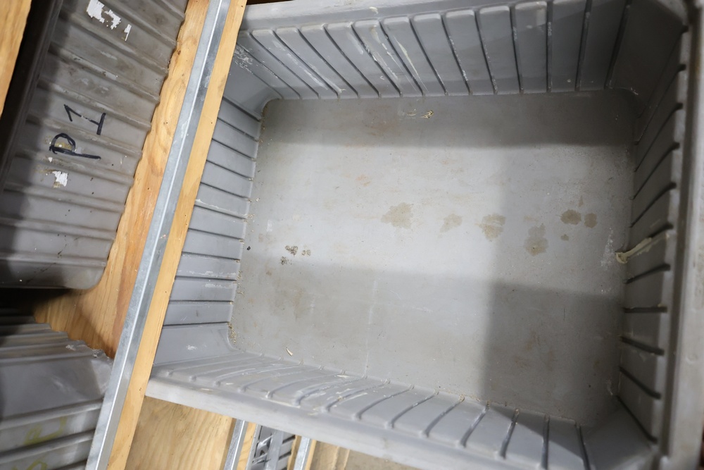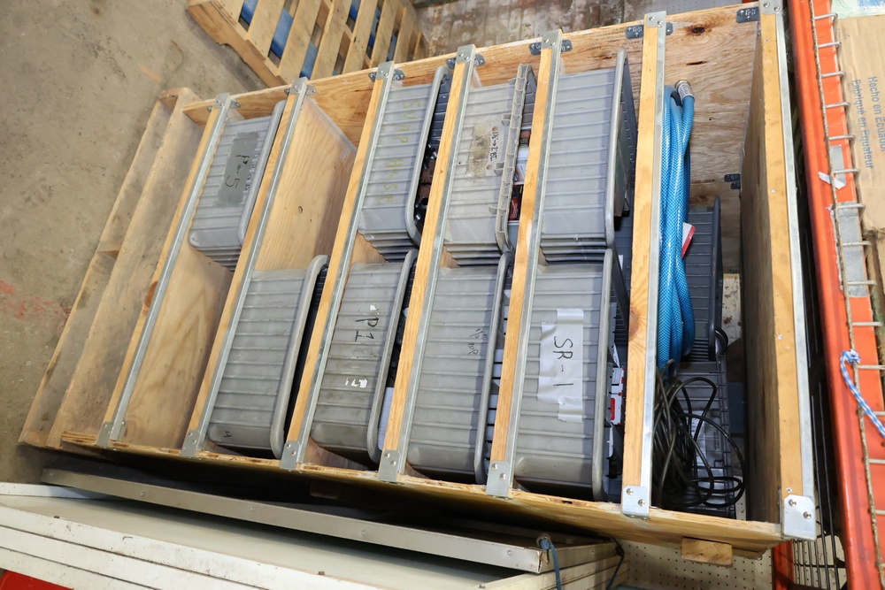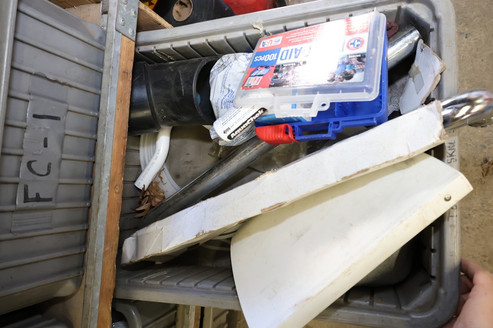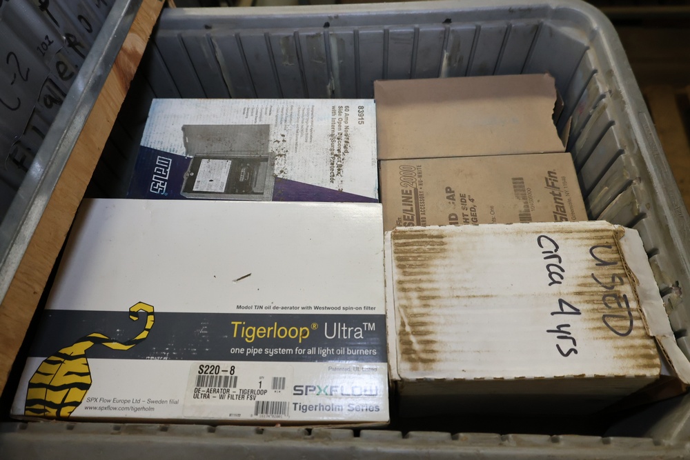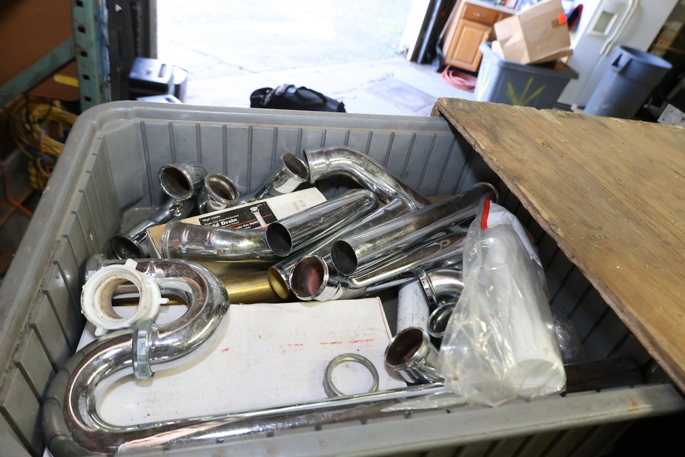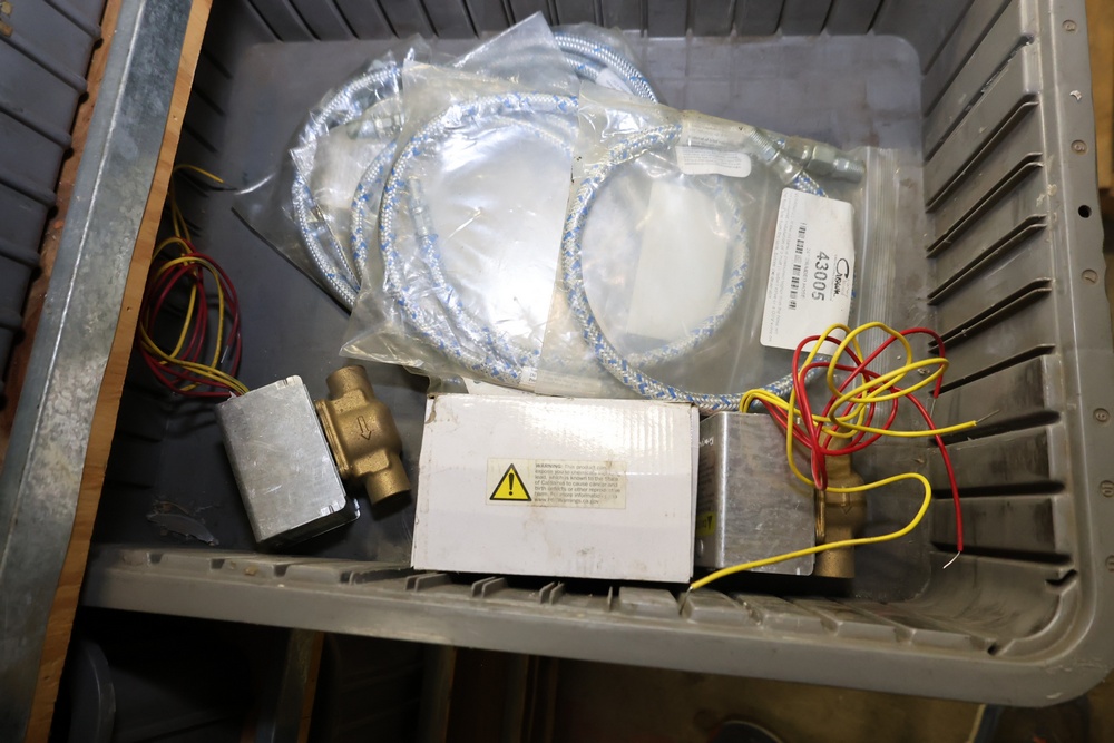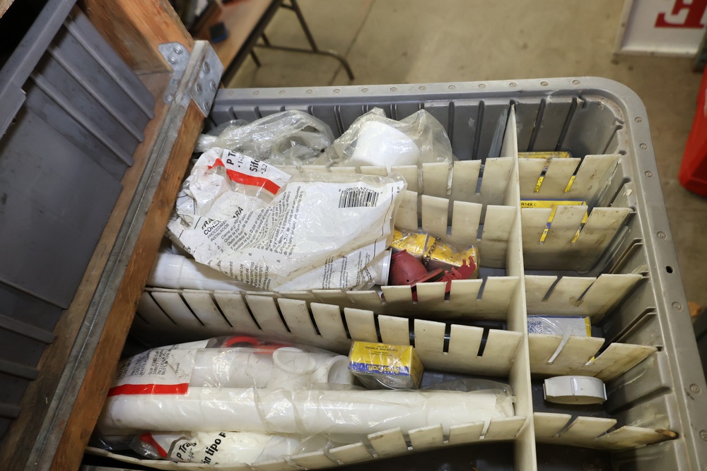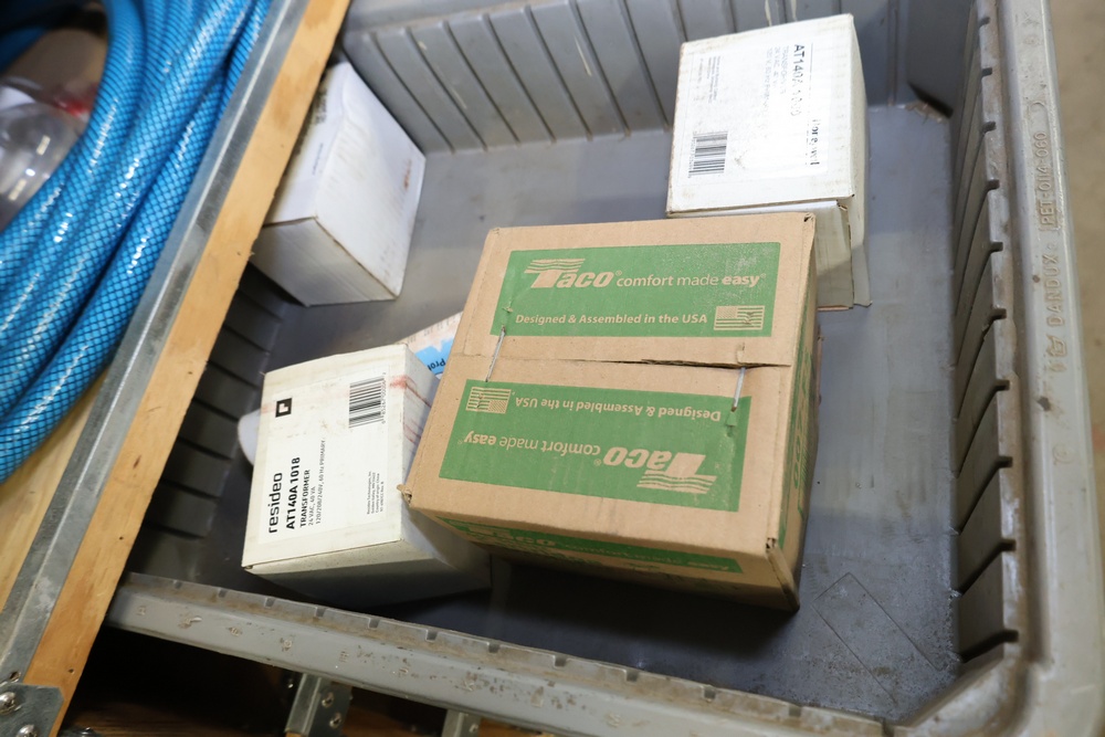Four shelving units containing approx. 40 labeled plastic bins filled with assorted plumbing and mechanical components. Contents include PVC, ABS, and copper pipe fittings in various sizes and configurations, rubber couplings with stainless steel clamps, electrical boxes, pipe adhesives, valves, and related hardware. The lot also includes the shelving structure and all storage containers as shown. Buyer must take all.