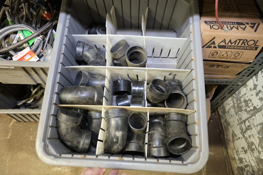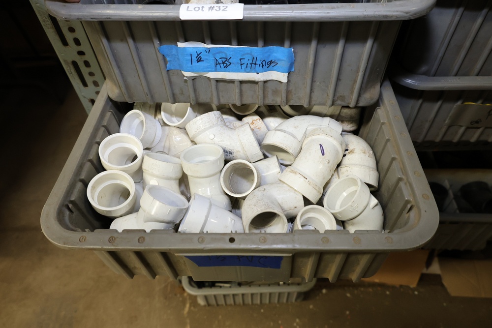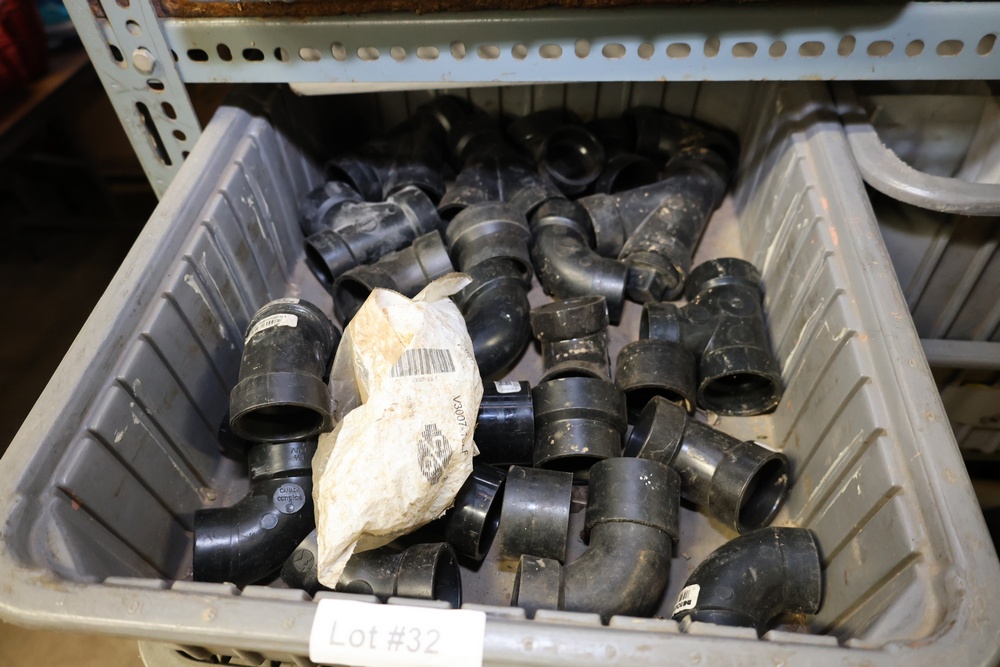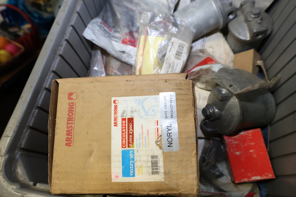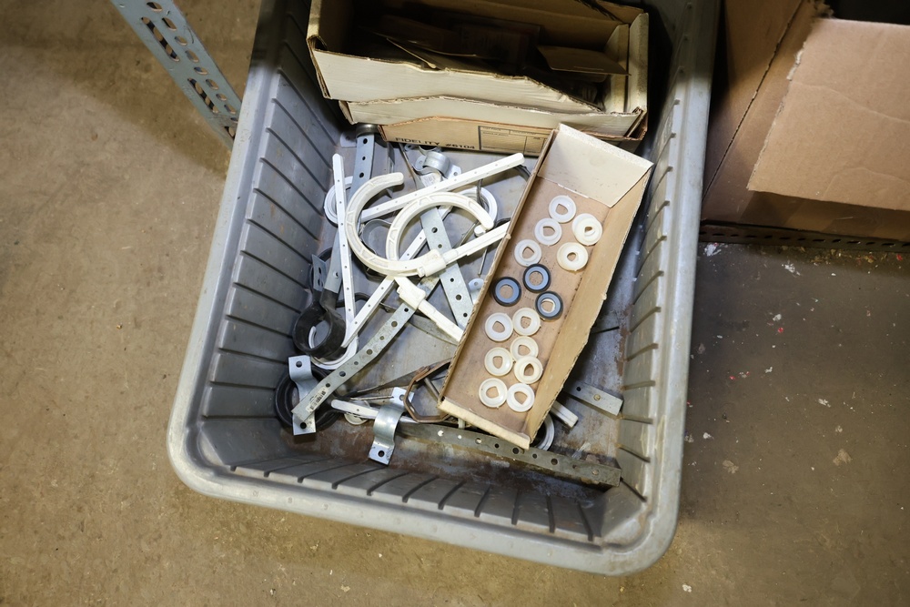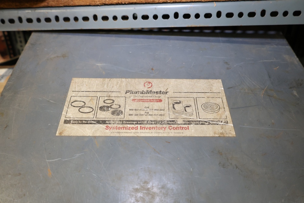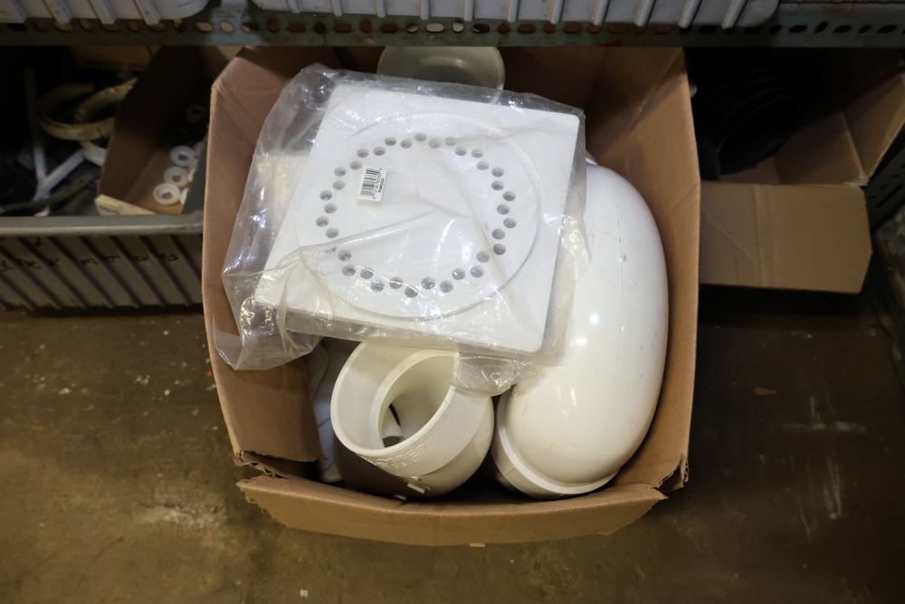 Bins and shelving unit with assorted plumbing and hardware components. Includes multiple plastic bins containing fittings, connectors, and valves, a green pump in its original box, and unopened boxes of parts. Shelving unit is made of metal and features multiple adjustable shelves. Some items are pre-owned, while others appear unused in original packaging. Pickup only. Buyer must take all.